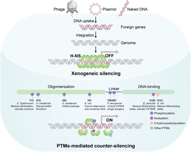 中國科學院南海海洋研究所王曉雪研究員團隊,2025年9月20日在微生物領域國際權威期刊FEMS Microbiology Reviews發表題為“Post-translational Modifications of the Nucleoid Protein H-NS: Sites,Mechanisms,and Regulatory Cues”的綜述論文。該研究系統梳理細菌類組蛋白H-NS的多種翻譯后修飾模式,提出這些修飾模式構成“細菌類組蛋白密碼”,揭示H-NS通過翻譯后修飾驅動細菌基因組進化的精密機制,為理解細菌環境適應、致病機制及開發新型抗菌策略提供重要理論支撐。博士后劉亞博為第一作者,研究員王曉雪為通訊作者。基因組壓縮與動態調控是生命體共通的核心科學問題。細菌缺乏真核生物核小體結構,主要依賴H-NS等核結合蛋白實現基因組的壓縮與調控功能。H-NS可沉默原噬菌體、毒力島等外來基因元件,維持基因組穩定性。研究發現細菌又能在特定環境下解除H-NS的沉默并激活外源基因表達,這一過程是細菌環境適應的關鍵過程。但細菌宿主如何感應外界環境變化,通過H-NS實現對外來基因元件的精準調控是領域內備受關注的科學問題。研究整合大腸桿菌、銅綠假單胞菌、希瓦氏菌和殺魚愛德華氏菌等多物種證據,闡釋H-NS通過其N端寡聚化域、中間柔性連接區和C端DNA結合域發生多種翻譯后修飾調控其沉默功能:N端修飾調整H-NS聚合狀態,掌控基因沉默開關;中間區修飾重塑電荷分布;C端修飾直接改變其對高AT含量DNA的結合能力(圖1)。翻譯后修飾是拮抗H-NS沉默的關鍵機制,與已知的抗沉默蛋白、小分子代謝物及蛋白酶解等途徑協同作用,通過感知環境信號、傳導調控指令,最終實現表型輸出,助力細菌利用外源基因增強環境適應性。尤為重要的是,研究進一步提出,外源基因常編碼修飾酶或抗沉默蛋白,在激活條件下解除H-NS介導的基因沉默。這一由外來元件參與的主動“轉錄解抑制”過程充分呈現了細菌與外來基因元件間的競爭與協作關系,是系統認識微生物中水平基因轉移的重要視角。本研究工作得到國家自然科學基金、國家科技基礎資源調查專項、中國博士后科學基金及ONCE等項目的資助。相關論文信息:Yabo Liu,Xiaoxue Wang*. Post-translational modifications of the nucleoid protein H-NS: sites,mechanisms,and regulatory cues.?2025,FEMS Microbiology Reviews,fuaf045.?論文鏈接:https://doi.org/10.1093/femsre/fuaf045圖1?H-NS沉默外源基因表達與翻譯后修飾介導抗沉默機制