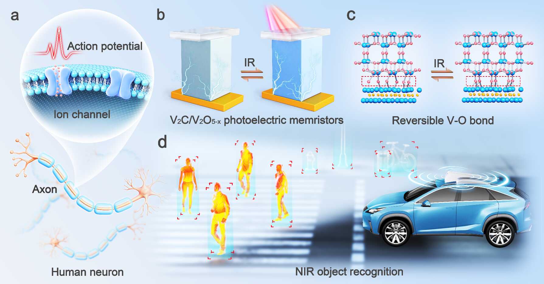 近紅外(NIR)光子探測與目標識別是自動駕駛、夜間監控和戰術偵察等領域實現全天候目標識別的關鍵技術。然而,傳統近紅外探測系統受限于分立式架構與馮·諾依曼瓶頸,普遍存在能效低、信號傳輸延遲大等問題。利用紅外敏感型易失性憶阻器構建的人工感知神經元,為實現低功耗實時高效處理的神經形態紅外感知器件提供了新途徑。近紅外(NIR)光子探測與目標識別是自動駕駛、夜間監控和戰術偵察等領域實現全天候目標識別的關鍵技術。然而,傳統近紅外探測系統受限于分立式架構與馮·諾依曼瓶頸,普遍存在能效低、信號傳輸延遲大等問題。利用紅外敏感型易失性憶阻器構建的人工感知神經元,為實現低功耗實時高效處理的神經形態紅外感知器件提供了新途徑。近日,中國科學院深圳先進技術研究院材料人工智能研究中心王佳宏團隊在光電憶阻器領域取得新突破,在材料學術期刊Advanced Materials上發表了題為"2D Vanadium Carbide/Oxide Heterostructure-Based Artificial Sensory Neuron for Multi-Color Near-Infrared Object Recognition"的研究論文。該研究通過拓撲化學轉化法開發出一種同時具備近紅外響應特性和易失性電阻開關行為的二維碳化釩/氧化釩異質結構。基于該異質結構的憶阻器不僅在數千次循環中表現出穩定的閾值型電阻切換(RS)行為,而且具有近紅外光功率強度和波長的閾值電壓調制能力,可以實現人工感知神經元生物行為模擬。通過與YOLOv7算法結合構建用于多波段紅外目標識別的人工神經網絡(ANN),實現對FLIR數據集上多種目標物體的檢測與識別(圖1)。研究團隊提出“新型紅外響應光電憶阻器設計”新思路,工作亮點如下:多功能界面融合二維異質結構:通過對V2CTx進行精確控制的溫和氧化拓撲化學轉化,成功合成了具有多功能界面融合的V2C/V2O5-x二維異質結構。該結構通過金屬性的V2C與富含氧空位的介電材料V2O5-x相結合,利用V2O5-x和V中空位擴散以及異質結界面處的V-O鍵重排,實現了憶阻器閾值型易失性電阻開關能力與近紅外響應特性(圖2)。卓越的多色近紅外響應易失性型憶阻器:V2C/V2O5-x憶阻器展現出穩定的閾值型易失性特性,其轉變電壓的變異系數低至1.62%和1.7%。研究還發現,通過調節785nm至1550nm波段的近紅外光功率密度與波長,可有效調控該憶阻器的閾值電壓,模擬生物神經元的動態行為(圖3)。復雜駕駛場景中關鍵物體的精準檢測與識別:將V2C/V2O5-x憶阻器構建的人工感知神經元系統結合YOLOv7算法模型構建人工神經網絡架構,在FLIR數據集上對智能駕駛場景中汽車和行人的平均識別準確率可以達到87.7%和89.6%,展現出在復雜環境下的感知潛力(圖4)。這項工作不僅提出了一種新型紅外響應光電憶阻器設計思路,更展示了神經形態計算與近紅外感知融合的可能性。這種融合架構有望顯著提升邊緣計算設備的實時處理能力,為自動駕駛、智能安防等領域提供更高效、低功耗的超視覺感知解決方案中國科學院深圳先進技術研究院材料人工智能研究中心王佳宏副研究員為論文唯一通訊作者,渠源多博士及郝夢娣碩士研究生為論文共同第一作者。研究獲國家重點研發計劃、國家自然科學基金、廣東省自然科學基金杰青項目、深圳市科技計劃等項目支持。圖1 | 基于二維碳化釩/氧化釩異質結構的人工感知神經元實現多色近紅外目標識別示意圖。圖2 | V2C/V2O5-x異質結構制備示意圖和結構表征圖3 | Au/V2C/V2O5-x/ITO光電憶阻器的閾值轉換特性及近紅外光響應能力圖4 | 基于人工神經元的紅外目標檢測與識別神經網絡系統<!--!doctype-->