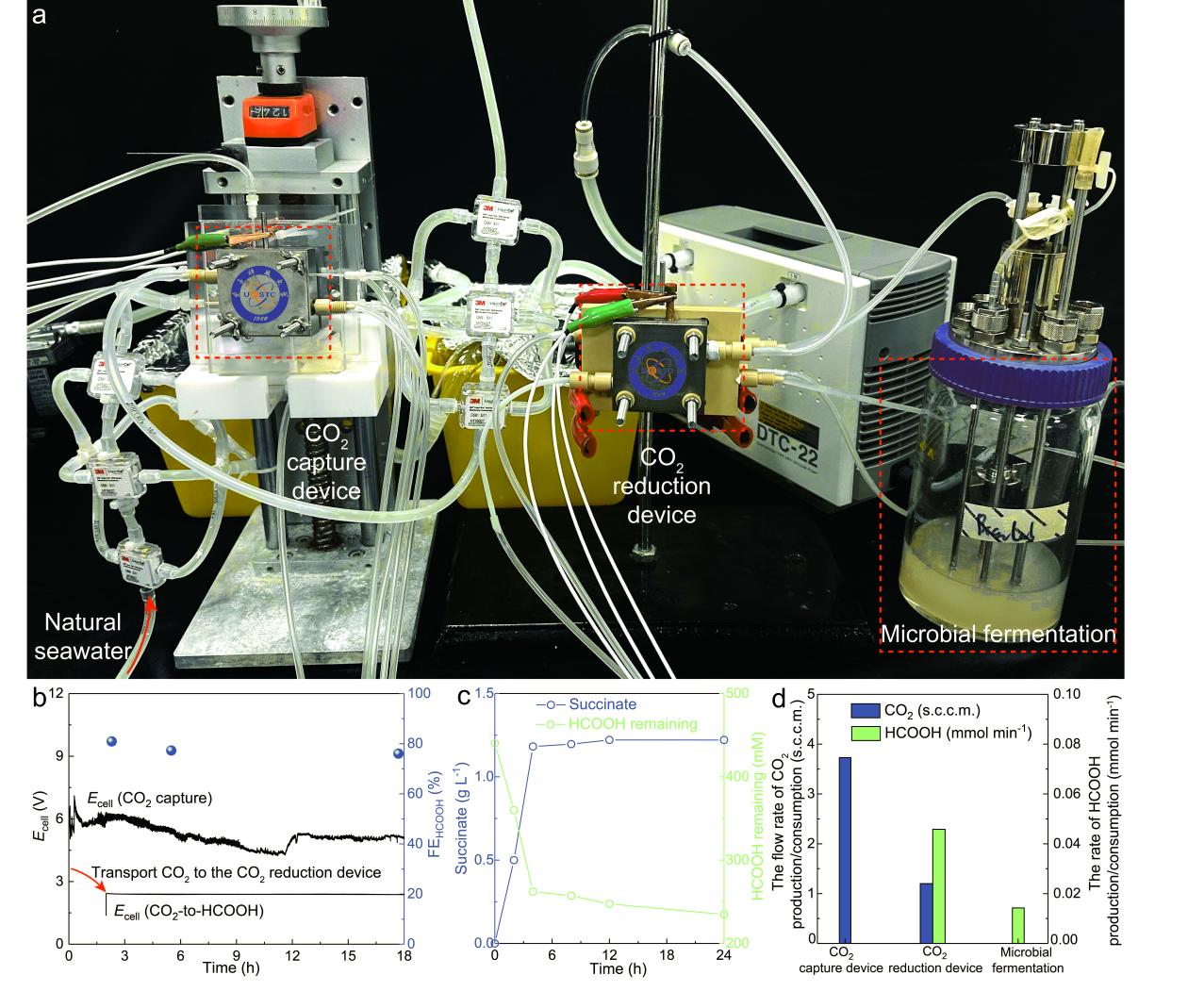 北京時間2025年10月6日,中國科學院深圳先進技術研究院合成生物學研究所高翔課題組與電子科技大學夏川課題組合作,在國際高水平學術期刊Nature Catalysis上發表了題為Efficient and scalable upcycling of oceanic carbon sources into bioplastic monomers的研究成果。團隊率先提出并驗證人工海洋碳循環系統:面向天然海水場景高效捕集CO2,電催化制備可進入生物制造的平臺中間體,再經工程化微生物升級轉化為高價值分子與材料。研究以可降解材料單體為示范,凸顯“捕碳造物”的平臺能力與可擴展性,為我國“藍色經濟”、雙碳目標與綠色低碳技術創新提供新路徑。北京時間2025年10月6日,中國科學院深圳先進技術研究院合成生物學研究所高翔課題組與電子科技大學夏川課題組合作,在國際高水平學術期刊Nature Catalysis上發表了題為Efficient and scalable upcycling of oceanic carbon sources into bioplastic monomers的研究成果。團隊率先提出并驗證人工海洋碳循環系統:面向天然海水場景高效捕集CO2,電催化制備可進入生物制造的平臺中間體,再經工程化微生物升級轉化為高價值分子與材料。研究以可降解材料單體為示范,凸顯“捕碳造物”的平臺能力與可擴展性,為我國“藍色經濟”、雙碳目標與綠色低碳技術創新提供新路徑。文章上線截圖文章鏈接:https://www.nature.com/articles/s41929-025-01416-4海洋作為地球最大的碳匯,每年吸收逾四分之一人為排放的二氧化碳,是維系全球氣候穩定和碳循環的重要天然緩沖器。然而,隨著大氣中二氧化碳濃度的持續上升,不僅加劇了氣候變化,并且海洋因大量吸收二氧化碳而出現酸化現象,威脅海洋生態安全。如何把已入海的碳資源化并減緩酸化,是海洋治理與綠色制造的共同命題。此次研究團隊自主研發電解裝置,可在真實海水環境下連續穩定運行超過500小時,以較低的能耗高效捕獲海水中的二氧化碳;所捕獲碳源經電催化轉化為高純甲酸,再由工程化海洋微生物升級為琥珀酸等平臺分子。以琥珀酸為例,團隊完成了材料端示范(如可降解塑料PBS制備),用以驗證從“海水捕碳—平臺中間體—生物升級—終端應用”的端到端可行性;所獲替代型生物化學品在性質上與石化同類一致,體現可持續的海洋碳資源利用路徑。該研究驗證了“以海治碳”的技術可行性,也為我國推進海洋碳匯資源化提供了范例。面向應用,隨著技術優化與規模化推進,有望在近海實現“邊捕碳、邊產料”的一體化布局,帶動綠色分子與材料產業發展,促進藍色經濟高質量增長。該工作緊扣“雙碳”與“藍色經濟”方向,為氣候治理、生態保護與綠色產業提供新方案,彰顯了中國科研團隊在全球綠色低碳科技創新中的擔當與貢獻。圖1 擬建的人工海洋碳捕集與循環利用系統研究團隊提出“人工海洋碳循環系統”的總體思路。該系統包括兩個關鍵環節:首先,通過新型的電解裝置直接從海水中捕集二氧化碳,有效避免了電極鈍化和鹽類沉積等問題,實現長期穩定運行;其次,將捕獲的二氧化碳通過電化學與生物催化過程,轉化為可替代化石工業來源的生物化學品。該路徑貫通了從“海水捕碳”到“綠色分子與材料”的全鏈條,以可降解塑料單體為示范,凸顯其在碳循環、資源利用和環境治理中的戰略意義(圖1)。圖2 利用固態電解質電解槽從海水中捕集二氧化碳研究團隊開發了一種用于海水碳捕集的裝置,并在結構設計與運行穩定性方面取得了突破。該裝置能夠以天然海水為原料實現連續二氧化碳捕集,在實際條件下穩定運行超過500小時,顯著提升了系統的可靠性。實驗結果顯示,該裝置的碳捕獲效率超過70%,并可同步副產氫氣;其捕獲每噸二氧化碳的成本僅為229.9美元,展現出潛在的經濟競爭力。該成果不僅驗證了直接利用天然海水實現持續“捕碳”的可行性,也為將海洋碳匯轉化為綠色分子與材料、推動海洋經濟發展提供了新的可能性(圖2)。圖3 Bi-BEN 的結構表征研究團隊通過兩步法成功合成了Bi-BEN(鉍基金屬有機框架衍生)催化劑。首先經溶劑熱反應制備鉍基金屬有機框架材料,隨后在電化學原位重構過程中形成由有機配體修飾的Bi納米顆粒。通過單晶衍射、X射線吸收光譜等多種表征手段系統驗證了其結構特征,確認了該催化劑材料在實際工況條件下的真實結構(圖3)。圖4 Bi-BEN與Bi納米顆粒的二氧化碳電還原性能及機理研究研究團隊系統對比了Bi-BEN與未修飾Bi納米顆粒催化劑在二氧化碳電還原反應(CO2RR)中的性能差異。結果表明,Bi-BEN催化劑具有較高的催化活性和甲酸選擇性,在720 mA cm-2的甲酸偏電流密度下僅需-1.37 V(相對于可逆氫電極)的過電位,并且穩定性得到明顯提升。進一步結合原位光譜與理論計算分析發現,Bi-BEN 的優越性能源于有機配體對關鍵反應中間體HCOO*的穩定作用,從而協同提升了催化劑的活性、選擇性和穩定性(圖4)。圖5 甲酸的電化學生產及其向琥珀酸的微生物轉化為驗證依托海洋資源發展海洋經濟、利用海水制造綠色材料的可行性,研究團隊構建了電催化和生物催化的耦合過程,并以生物塑料為示例完成從捕碳到終端制品的貫通示范。首先,利用Bi-BEN催化劑并通過放大固態電解反應器獲得高濃度的純甲酸溶液,并在連續運行20天內保持穩定產出。隨后,工程化的海洋細菌Vibrio natriegens(需納弧菌)能夠以甲酸為唯一碳源實現高效生長,并將其進一步轉化為琥珀酸和乳酸。該“電催化+合