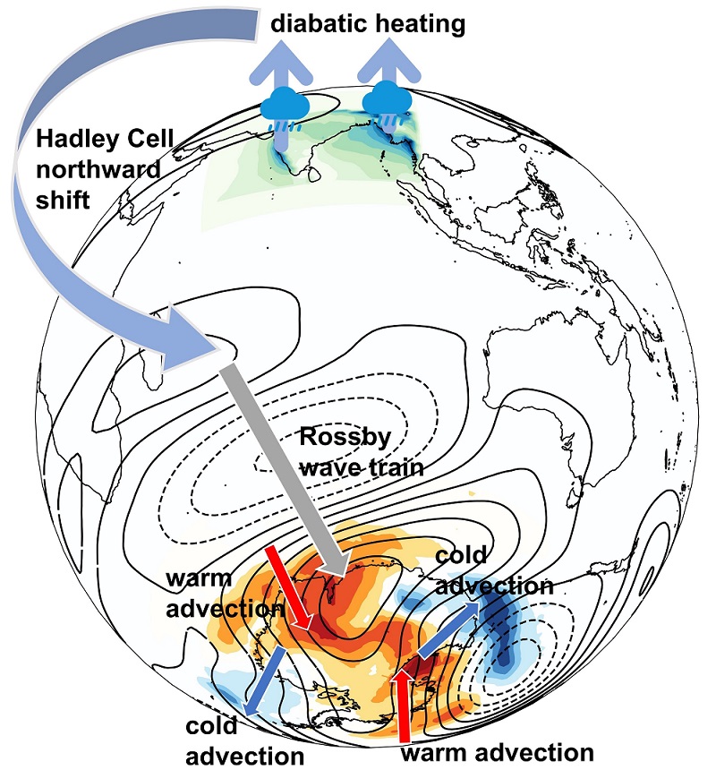 近日,中國(guó)科學(xué)院南海海洋研究所熱帶海洋環(huán)境實(shí)驗(yàn)室(LTO)與全球海洋和氣候研究中心(GOCRC)王春在研究員團(tuán)隊(duì)在一區(qū)TOP期刊 npj Climate and Atmospheric Science 發(fā)表最新成果,揭示了印度夏季風(fēng)降水如何通過(guò)跨半球機(jī)制影響南極氣候和海冰分布。論文由LTO博士研究生宋強(qiáng)華擔(dān)任第一作者,研究員王春在為通訊作者,合作作者還包括LTO研究員張磊和中山大學(xué)副教授范漢杰。近年來(lái),南極及周邊海域的氣候變化愈加顯著,不僅影響極地生態(tài),還對(duì)全球大氣和海洋環(huán)流系統(tǒng)產(chǎn)生深遠(yuǎn)影響。明確南極氣候的關(guān)鍵驅(qū)動(dòng)因素,對(duì)于預(yù)測(cè)未來(lái)極地及全球氣候變化趨勢(shì)、評(píng)估海平面上升風(fēng)險(xiǎn)具有重要意義。以往研究多聚焦于海洋多尺度變率對(duì)南極氣候的作用,而本研究首次提出印度夏季風(fēng)降水也能通過(guò)大氣過(guò)程跨越半球,調(diào)控南極地表氣溫和海冰分布(圖1)。研究表明,印度夏季風(fēng)降雨釋放潛熱,使得印度洋區(qū)域的哈德萊環(huán)流整體北移。這一變化在南印度洋馬斯克林群島附近激發(fā)出大氣羅斯貝波列,并沿南印度洋傳播至南極。羅斯貝波的傳遞改變了南極的海平面氣壓格局,進(jìn)而在東西南極沿岸形成風(fēng)場(chǎng):近岸風(fēng)導(dǎo)致南極大陸大范圍升溫,而離岸風(fēng)觸發(fā)的冷平流則影響羅斯海和威德?tīng)柡!@渑諝獾妮斔褪鼓蠘O地表溫度發(fā)生變化,海冰分布呈現(xiàn)出類似“三極子”的模態(tài)特征。該研究不僅揭示了印度夏季風(fēng)降水與南極氣候和海冰之間的物理聯(lián)系,還為提升南極海冰的季節(jié)預(yù)測(cè)能力、完善氣候動(dòng)力學(xué)理論框架提供了新的科學(xué)依據(jù),同時(shí)深化了人們對(duì)熱帶–極地遙相關(guān)及其氣候效應(yīng)的理解。本研究得到了國(guó)家自然基金委合作創(chuàng)新研究團(tuán)隊(duì)項(xiàng)目、國(guó)家自然科學(xué)基金重大項(xiàng)目等共同資助。相關(guān)論文信息:Song,Q.,Wang,C.,Zhang,L.,Fan,H. Indian summer monsoon rainfall drives Antarctic climate and sea ice variability through atmospheric teleconnections. npj Clim Atmos Sci 8,320 (2025).文章鏈接:https://doi.org/10.1038/s41612-025-01213-7圖 1??印度夏季風(fēng)降水對(duì)南極氣候影響的示意圖。印度夏季風(fēng)降水釋放的非絕熱加熱導(dǎo)致哈德萊環(huán)流向北移動(dòng),從而激發(fā)羅斯貝波列(等值線)從南印度洋馬斯克林群島向南極傳播。該羅斯貝波列改變了海平面氣壓,為東南極大陸和西南極大陸帶來(lái)暖平流(南極區(qū)域紅色箭頭),同時(shí)在羅斯海和威德?tīng)柡^(qū)域則形成明顯的冷平流輸送(南極區(qū)域藍(lán)色箭頭)。