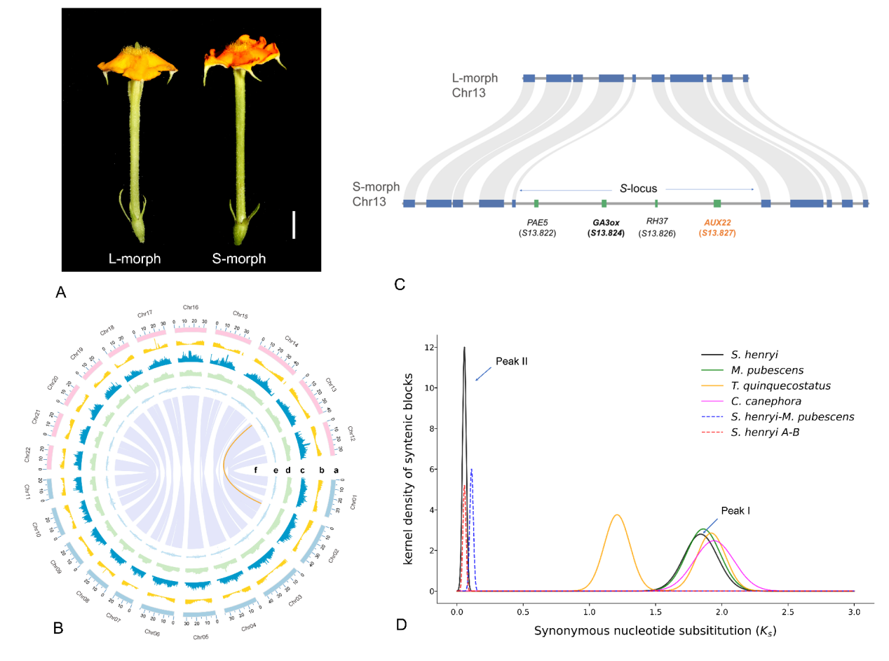 花部形態(tài)的多樣性在被子植物進(jìn)化中扮演著核心角色,也是物種分化的重要推動(dòng)力量。異型花柱(Heterostyly)是一種由S位點(diǎn)超基因(S-locus supergene)控制的花型多態(tài)現(xiàn)象,早在19世紀(jì)就已受到達(dá)爾文等學(xué)者的廣泛關(guān)注。異型花柱是指同一物種的群體中存在兩種(二型花柱)或三種(三型花柱)雌雄蕊高度互補(bǔ)的個(gè)體,這種花部結(jié)構(gòu)具有提高植物傳粉精確度、降低雌雄干擾、促進(jìn)異花傳粉等重要生態(tài)功能。達(dá)爾文曾將其形象地稱為“A most complex marriage arrangement” (Darwin 1864,Journal of the Proceedings of the Linnean Society)。全基因組復(fù)制(Whole Genome Duplication,WGD)或多倍化(polyploidization)是生物體的全部遺傳信息發(fā)生一次或多次復(fù)制的過(guò)程,對(duì)被子植物繁育系統(tǒng)和形態(tài)演化具有重要影響。經(jīng)典觀點(diǎn)認(rèn)為,多倍化常導(dǎo)致異型花柱向同型花柱轉(zhuǎn)變,即“基因組加倍引發(fā)異型花柱的瓦解”。然而,以往對(duì)異型花柱分子調(diào)控機(jī)制的研究都局限于二倍體,對(duì)于多倍體植物異型花柱的發(fā)生和演化還存在諸多未解之謎。該研究首次完成了茜草科四倍體二型花柱植物——裂果金花(Schizomussaenda henryi)的染色體水平基因組組裝與解析,揭示了其控制花柱異長(zhǎng)的S位點(diǎn)超基因在多倍化后仍保持完整功能。基于全基因組測(cè)序、比較轉(zhuǎn)錄組、形態(tài)學(xué)、繁殖生物學(xué)等多種手段,獲得了裂果金花高質(zhì)量的染色體水平基因組,并鑒定到二型花柱相關(guān)的S-locus超基因只存在于短柱花型的個(gè)體,呈半合子(hemizygosity)結(jié)構(gòu);由包含SchzAUX22在內(nèi)的四個(gè)緊密連鎖的基因構(gòu)成。其中,SchzAUX22?是重要的生長(zhǎng)素響應(yīng)因子,被鑒定為調(diào)控二型花柱發(fā)育的關(guān)鍵候選基因。系統(tǒng)學(xué)和k-mer分析表明,裂果金花的基因組可能起源于約360萬(wàn)年之前的異源多倍化事件。通過(guò)計(jì)算S-locus基因和其同源基因的同義替換率(Ks),發(fā)現(xiàn)S-locus的起源時(shí)間(約5000萬(wàn)年前)遠(yuǎn)早于裂果金花多倍化的發(fā)生時(shí)間。這些證據(jù)表明,盡管裂果金花存在由雜交導(dǎo)致的異源多倍化,S位點(diǎn)仍能保持完整并發(fā)揮功能;多倍化并不必然導(dǎo)致異型花柱的瓦解。這是首次從全基因組層面破譯多倍體植物異型花柱的分子機(jī)制。該成果為深入理解被子植物花部多態(tài)性及繁育系統(tǒng)的進(jìn)化提供了新的視角。在達(dá)爾文發(fā)表《同種植物的不同花型》(The different forms of flowers on plants of the same species)148年后,人類對(duì)植物交配機(jī)制的理解再次迎來(lái)突破。中國(guó)科學(xué)院華南植物園研究團(tuán)隊(duì)與山東理工大學(xué)羅中萊教授、加拿大多倫多大學(xué)著名進(jìn)化生物學(xué)家Spencer C.H. Barrett教授等科研人員的合作研究成果,以“Genetic architecture of the?S-locus supergene revealed in a tetraploid distylous species”為題近日發(fā)表在植物科學(xué)領(lǐng)域權(quán)威期刊New Phytologist(《新植物學(xué)家》)(生物學(xué)一區(qū)TOP,IF5year=10.3)上。中國(guó)科學(xué)院華南植物園張奠湘研究員、石苗苗助理研究員及山東理工大學(xué)羅中萊教授為共同通訊作者,羅中萊教授為第一作者,華南植物園為第一完成單位。研究得到了國(guó)家自然科學(xué)基金面上項(xiàng)目、廣東省自然資源事務(wù)專項(xiàng)資金等資助。文章鏈接:https://nph.onlinelibrary.wiley.com/doi/10.1111/nph.70521圖. A.?裂果金花(Schizomussaenda henryi)長(zhǎng)柱型花(L-morph)與短柱型花(S-morph);B.?短柱型基因組Circos圖;C.?半合子位點(diǎn)基因結(jié)構(gòu)示意圖;D.?裂果金花與近緣物種旁系同源基因的Ks分布分析。