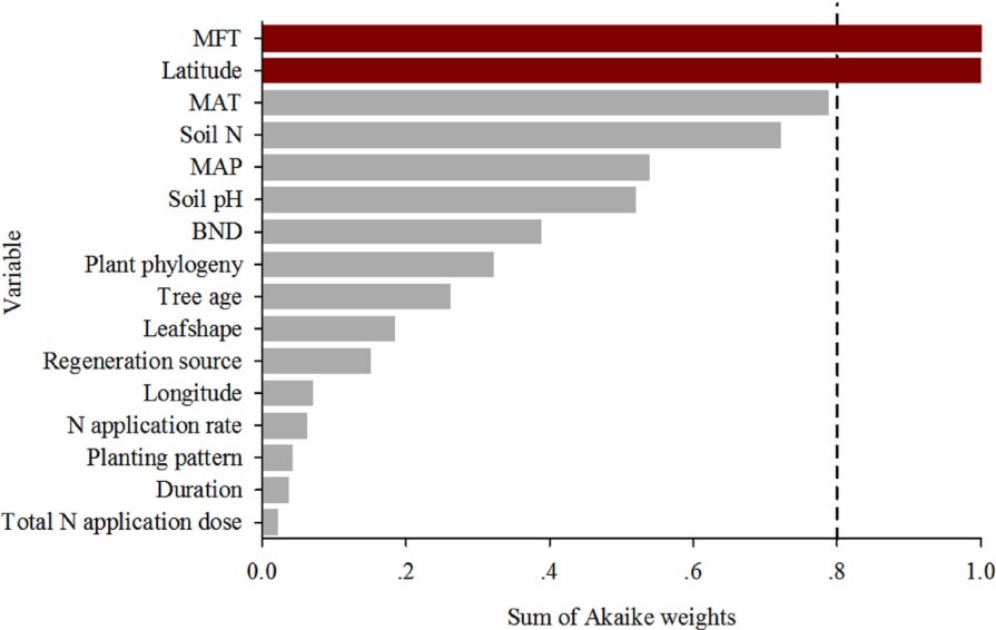 近幾十年來(lái),人為活動(dòng)導(dǎo)致的大氣氮沉降持續(xù)增加,深刻影響著森林生態(tài)系統(tǒng)的生產(chǎn)力和碳匯功能。氮素是限制森林初級(jí)生產(chǎn)力的關(guān)鍵元素之一。增加氮素輸入可以刺激森林生產(chǎn)力及其生物量中的碳(C)固存,但這種影響的程度和全球重要性仍然還未得到系統(tǒng)評(píng)估。中國(guó)科學(xué)院華南植物園鼎湖山站博士后陳國(guó)茵、胡苑柳等科研人員,通過(guò)整合全球范圍內(nèi)的123項(xiàng)氮添加實(shí)驗(yàn)數(shù)據(jù)(涵蓋71個(gè)樹(shù)種,189組觀測(cè)),深入探究了不同樹(shù)種的生物量碳固存對(duì)氮添加的響應(yīng)規(guī)律。同時(shí),采用單位氮添加引起的樹(shù)木生物量碳增益(CperN)這一指標(biāo),以更準(zhǔn)確地量化氮沉降的碳匯效應(yīng),并利用全球菌根樹(shù)木分布圖估算了菌根類型調(diào)控下的全球樹(shù)木碳固存潛力。研究發(fā)現(xiàn):(1)緯度是調(diào)控樹(shù)木生物量CperN的關(guān)鍵環(huán)境因子,CperN隨緯度升高而增加,表明高緯度氮限制生態(tài)系統(tǒng)對(duì)氮添加的響應(yīng)更敏感;(2)菌根類型是導(dǎo)致樹(shù)木響應(yīng)差異的最重要生物學(xué)因子,AM樹(shù)木的CperN平均約為ECM樹(shù)木的6倍(17.2 vs. 2.9 kg C kg N?1),這源于兩者截然不同的氮獲取策略:ECM樹(shù)木及其真菌能直接利用有機(jī)氮,策略保守;而AM樹(shù)木更依賴無(wú)機(jī)氮,因此能從氮添加中獲得更大生長(zhǎng)收益。研究進(jìn)一步估算表明,若忽略菌根類型的差異,全球尺度上氮沉降的樹(shù)木碳固存總量將被高估12%(約9.8 Tg C yr?1),在溫帶森林中甚至?xí)桓吖?7%。這種高估主要源于ECM樹(shù)種在溫帶森林中占主導(dǎo)地位但其CperN相對(duì)較低。研究強(qiáng)調(diào),未來(lái)的全球生物地球化學(xué)模型必須充分考慮菌根類型的分布及其功能差異,才能更準(zhǔn)確地預(yù)測(cè)氮沉降背景下森林碳匯的變化趨勢(shì)。相關(guān)研究成果以“Tree-mycorrhizal types differ in their biomass response to nitrogen addition”為題近日在線發(fā)表在國(guó)際學(xué)術(shù)期刊Soil Biology and Biochemistry(《土壤生物學(xué)與生物化學(xué)》)(IF=10.2)上。中國(guó)科學(xué)院華南植物園鼎湖山站博士后陳國(guó)茵為論文第一作者,鼎湖山站博士后胡苑柳與廣東省科學(xué)院廣州地理所吳建平副研究員為共同第一作者,鄧琦研究員為論文通訊作者。文章鏈接:https://doi.org/10.1016/j.soilbio.2025.109967圖1. 氮沉降對(duì)植物生物量CperN影響因子的重要性圖2. 氮沉降下植物生物量CperN在同樹(shù)種類型和生態(tài)系統(tǒng)的差異