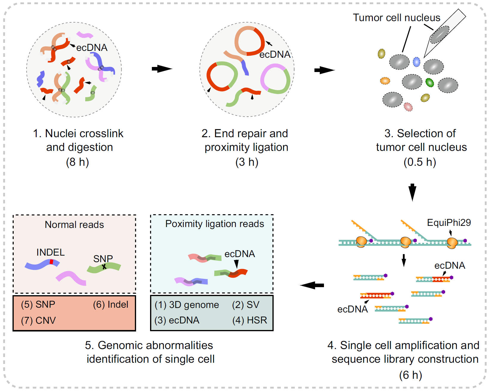 近日,中國科學院廣州生物醫藥與健康研究院譜系基因組多維技術研究組林達研究員在Nature Communications期刊發表研究成果,報道了新開發的單細胞多組學技術-Uniform Chromosome Conformation Capture(Uni-C)。該方法可在一個細胞中同時解析基因組大尺度結構變異(如SV、CNV、ecDNA)、小尺度突變(SNP/INDEL)以及染色質三維構象,實現高分辨率、多維度的聯合分析(圖1)。近日,中國科學院廣州生物醫藥與健康研究院譜系基因組多維技術研究組林達研究員在Nature Communications期刊發表研究成果,報道了新開發的單細胞多組學技術-Uniform Chromosome Conformation Capture(Uni-C)。該方法可在一個細胞中同時解析基因組大尺度結構變異(如SV、CNV、ecDNA)、小尺度突變(SNP/INDEL)以及染色質三維構象,實現高分辨率、多維度的聯合分析(圖1)。胰腺癌異質性強、進展迅速,臨床面臨早篩困難、治療靶點匱乏等挑戰。循環腫瘤細胞(CTCs)因攜帶原發瘤的完整基因組信息,被視為無創檢測和動態監測的重要窗口。然而,CTCs數量稀少、單細胞分析難度高,亟需關鍵檢測技術。研究團隊利用Uni-C技術對胰腺癌來源的CTCs進行分析,僅整合7個細胞數據,即可還原約89%的SNP/INDEL與75%的結構變異,與腫瘤組織檢測結果高度一致,驗證了該方法在稀有細胞中的準確性與代表性。進一步分析發現,Uni-C可解析CTC中ecDNA的分子結構,以及處于細胞周期不同階段CTC所展現出的染色質構象差異,如A/B隔室重構與高階結構消失等,為評估CTC活性與細胞狀態提供了新維度。值得注意的是,染色質三維結構不僅承載空間信息,還與基因表達密切相關。Uni-C所獲取的單細胞層面染色質構象數據,為揭示基因組結構變異與轉錄調控網絡之間的潛在關聯提供了可能。例如,不同細胞周期階段的染色質折疊狀態,反映了轉錄活性變化,提示Uni-C在探索腫瘤細胞異質性調控機制方面具有重要潛力。在功能應用方面,研究結合Uni-C所獲突變數據開展個體化新抗原預測,并通過合成多肽與動物實驗驗證部分候選新抗原具備明確免疫原性,聯合免疫治療可有效抑制腫瘤生長,展現出良好的治療潛力。該研究首次在單細胞水平實現了對CTCs中多類型基因組異常與染色質構象的聯合解析,并具備探索其在轉錄調控與免疫應答中的功能意義的能力。Uni-C為稀有腫瘤細胞的演化追蹤、靶點發現與個體化治療提供了有力技術支撐,推動單細胞多組學在腫瘤精準醫學中的轉化應用。上海交通大學醫學院附屬第一人民醫院助理研究員高小臣與中國科學院廣州生物醫藥與健康研究院副研究員李欣宇為本研究的共同第一作者,上海交通大學醫學院附屬第一人民醫院楊玉琴主任、中國科學院廣州生物醫藥與健康研究院林達研究員為共同通訊作者。論文鏈接圖1?Uni-C單細胞多維組學測序文庫構建流程