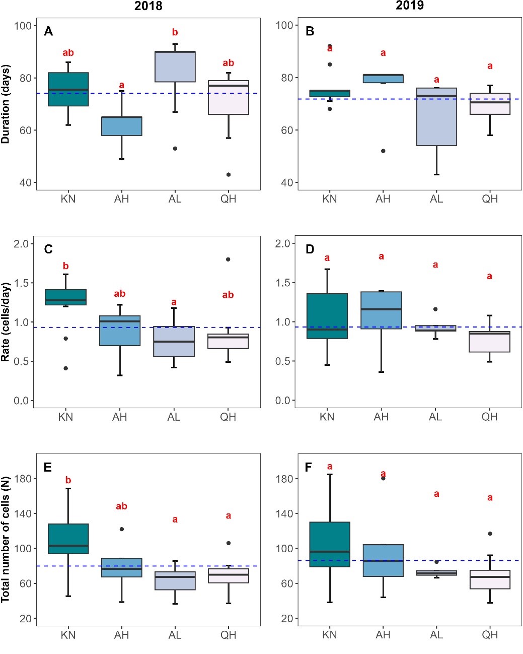 森林木質部碳庫作為新興熱點研究領域之一,相較于傳統認知上的其他組分碳儲量(如冠層、凋落物和根系等),其碳密度更高且周轉周期長,在緩解氣候變化上的作用可能更具韌性。在全球變暖背景下,春季物候提前和生長季延長理論上為森林提供了更長的光合作用時間窗口,有潛力促進生長量的增加。但目前對于樹木木質部生長周期與生長量間的關系還存在爭議,我們在新疆阿爾泰干旱與半干旱區開展了相關研究。科研團隊沿阿爾泰山脈南麓選取了四個森林樣地,覆蓋約400公里范圍。這些樣地代表了溫度和降水的自然過渡:西北部的喀納斯(KN)相對寒冷濕潤;海拔最高的阿勒泰高海拔樣地(AH),因高海拔而氣候更冷;海拔最低的阿勒泰低海拔樣地(AL),比AH更溫暖干燥;以及東南部的青河(QH),是最干旱的樣地。我們在四個研究地點共選取了35株健康、代表優勢樹種的西伯利亞云杉作為樣本樹。我們發現在2018年,最溫暖的阿勒泰低海拔站點(AL)擁有最長的持續時間(82.6 ± 13.3 天),但形成的木質部細胞數卻最少(63.88 ± 15.6 個),這表明生長季長度與木質部生長之間發生了解耦。這種解耦現象在2019年有所減弱,因為該年春季氣溫低于2018年,且夏季降水量高于2018年。春季氣溫升高可通過觸發形成層活動提前開始,從而延長木質部細胞生產的持續時間。充足的夏季降水為膨壓驅動的細胞分裂和擴張提供了必要的水分,提高了細胞生產率,這對干旱和半干旱森林的木材生長至關重要。因此,更溫暖的春季氣溫可能放大所觀察到的解耦現象,而充足的夏季降水則可能減弱它。這種解耦突顯了季節性氣候因素在調節干旱和半干旱森林木材形成動態中的關鍵作用。隨著氣候變化的持續,更長、更溫暖的生長季可能放大水分可用性的重要性,在生長季水分條件不利時,將進一步限制森林生長和碳固存。相關研究結果已近期發表在學術期刊Journal of Ecology(《生態學雜志》)上。瑞士聯邦森林、雪與景觀研究所(Swiss Federal Institute for Forest,Snow and Landscape Research)王文錦博士后為論文第一作者,中國科學院華南植物園張亞玲副研究員為論文的通訊作者。該項目主要受到國家自然科學基金等項目的資助。論文鏈接:https://besjournals.onlinelibrary.wiley.com/doi/abs/10.1111/1365-2745.70066圖. 木質部細胞生長季、生長速度和細胞量在樣方和年際間的差異