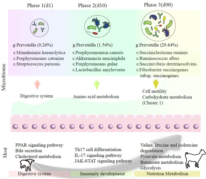 ?中國科學院亞熱帶農(nóng)業(yè)生態(tài)研究所畜禽健康養(yǎng)殖與農(nóng)牧復合生態(tài)研究中心譚支良研究員團隊在反芻動物微生物-宿主互作機制研究領域取得重要進展。團隊通過構建山羊發(fā)育模型,首次系統(tǒng)揭示了瘤胃粘膜微生物與宿主上皮細胞的階段性協(xié)同發(fā)育規(guī)律,相關成果以Microbiome-host co-oscillation patterns in shaping ruminal ecosystem from birth to puberty in a goat model為題發(fā)表于SCIENCE CHINA-Life Sciences。中國科學院亞熱帶農(nóng)業(yè)生態(tài)研究所畜禽健康養(yǎng)殖與農(nóng)牧復合生態(tài)研究中心譚支良研究員團隊在反芻動物微生物-宿主互作機制研究領域取得重要進展。團隊通過構建山羊發(fā)育模型,首次系統(tǒng)揭示了瘤胃粘膜微生物與宿主上皮細胞的階段性協(xié)同發(fā)育規(guī)律,相關成果以Microbiome-host co-oscillation patterns in shaping ruminal ecosystem from birth to puberty in a goat model為題發(fā)表于SCIENCECHINA-Life Sciences。作為反芻動物的"發(fā)酵工廠",瘤胃依靠微生物-宿主的精密互作實現(xiàn)植物纖維資源的高效轉(zhuǎn)化。其中,粘膜附著微生物通過與宿主上皮細胞的直接互作,在營養(yǎng)代謝和免疫調(diào)控中發(fā)揮關鍵作用。然而,從新生到反芻成熟階段,宿主-微生物互作網(wǎng)絡的動態(tài)變化仍尚不清晰。因此,本研究采用轉(zhuǎn)錄組和擴增子等技術和構建互作網(wǎng)絡等分析手段,解析了從1日齡到90日齡的協(xié)同發(fā)育模式(圖1)。(1)粘膜菌群呈現(xiàn)“病原相關→粘液降解→纖維分解”的演替路徑。1日齡以Mannheimia等條件致病菌為主(占39.7%),10日齡Akkermansia muciniphila等粘液降解菌顯著富集(21.4%),至90日齡形成以Succiniclasticum ruminis等纖維分解菌為特征(58.3%)的成熟群落;(2)宿主粘膜呈現(xiàn)“免疫啟動→屏障塑造→代謝成熟”的發(fā)育軌跡。1日齡以先天免疫相關基因(TLR2/4、IL-17A、CXCL1/2/3等)高表達為主,10日齡則以粘液代謝核心基因(GCNT3、GAL3ST1)上調(diào)和抗氧化防御信號通路(JAK-STAT)激活為特征,至90日齡形成以代謝相關基因(ACADS、BDH1、HDAC)為主導的代謝網(wǎng)絡;(3)菌群-宿主互作呈現(xiàn)階段特異性模式,即在早期主要強調(diào)消化和免疫發(fā)育(如,Mannheimia等病原相關菌通過脂多糖-TLR4軸激活宿主固有免疫應答;菌群刺激Th17細胞分化,觸發(fā)IL-17/JAK2-STAT3通路保護早期粘膜完整性),而在后期則側(cè)重于增強營養(yǎng)代謝(如,纖維分解菌Succiniclasticum ruminis通過琥珀酸分流途徑提升丙酸產(chǎn)量,誘導宿主丁酸代謝酶基因BDH1上調(diào))。總之,瘤胃粘膜微生物與宿主的協(xié)同互作共同塑造了瘤胃生態(tài)系統(tǒng)。此研究得到了中國科學院戰(zhàn)略性先導科技專項子課題、西藏中央引導地方資金配套項目-西藏高寒區(qū)生態(tài)草牧業(yè)科技示范、湖南省自然科學基金和湖南省科技創(chuàng)新計劃的聯(lián)合資助。論文鏈接微生物與宿主協(xié)同發(fā)育模式