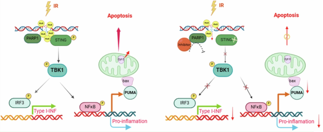 2025年2月13日,中國科學院廣州生物醫(yī)藥與健康研究院副研究員孫益嶸團隊和美國加州大學洛杉磯分校合作在Cell Death & Differentiation期刊發(fā)表題為“STING directly interacts with PAR to promote apoptosis upon acute ionizing radiation-mediated DNA damage”,證實了干擾素基因刺激因子(STING)蛋白可以通過一個全新的路徑(PARP1-PAR-STING)促進細胞凋亡。研究人員通過體內(nèi)和體外實驗研究了STING如何響應DNA輻射損傷,輻射導致的 DNA損傷可以激活PARP1蛋白,進而誘導PAR(多聚核糖)的過度合成,從而觸發(fā)STING蛋白介導的細胞死亡。對于STING基因缺陷的小鼠,對其腹部輻射后,相對于正常小鼠,存活率提升5倍,從11%躍升至67%,腸道病理損傷顯著減輕。通過給予低劑量的PARP1抑制劑PJ34來下調(diào)PAR的合成,則可以抑制STING激活,可以觀察到類似于在STING基因缺陷小鼠中觀察到的現(xiàn)象。這些結果揭示了PARP1-PAR-STING通路在輻射誘導的細胞凋亡途徑中的關鍵作用。該研究是對STING響應DNA損傷機制的全新認識,顛覆傳統(tǒng)認知,證明STING響應DNA損傷可不依賴于cGAMP而是直接與DNA損傷誘導的高濃度PAR相互作用,為抗輻射損傷提供全新思路。中國科學院廣州生物醫(yī)藥與健康研究院副研究員孫益嶸、加州大學洛杉磯分校助理教授Saba R. Aliyari為本論文的共同第一作者,中國科學院廣州生物醫(yī)藥與健康研究院副研究員孫益嶸及加州大學洛杉磯分校教授程根宏為通訊作者。該項目得到了天津市合成生物學重大專項以及廣東省自然科學基金的支持。論文鏈接PARP1-PAR-STING介導的細胞凋亡模式圖