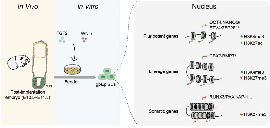 2025年1月9日,中國科學院廣州生物醫藥與健康研究院劉晶研究組與廣東省人民醫院朱平教授合作在Stem Cell Reports上在線發表題為“Capture Primed Pluripotency in Guinea Pig”的研究論文。本研究建立并表征了豚鼠始發態胚胎干細胞系(gpEpiSCs),為生物醫學科學提供了新的研究資源。2025年1月9日,中國科學院廣州生物醫藥與健康研究院劉晶研究組與廣東省人民醫院朱平教授合作在Stem Cell Reports上在線發表題為“Capture Primed Pluripotency in Guinea Pig”的研究論文。本研究建立并表征了豚鼠始發態胚胎干細胞系(gpEpiSCs),為生物醫學科學提供了新的研究資源。豚鼠在生殖發育、器官結構、免疫反應等方面比小鼠更為接近人類,一直以來在疾病模擬和研究生理發育方面作為模式動物發揮了重要作用。建立豚鼠多能干細胞系有利于進一步拓展豚鼠在醫學模型上的應用。在該項研究中,研究團隊從豚鼠植入后胚胎中成功分離培養出始發態多能干細胞系gpEpiSCs。這些細胞系在優化后的培養基中能穩定傳代并維持多能性,表達OCT4、SOX2和NANOG等關鍵多能性標志物,能夠形成具有三個胚層細胞類型的畸胎瘤,核型穩定。在信號調控上,FGF2、ACTIVINA和WNT信號通路在維持gpEpiSCs多能性和抑制分化中起關鍵作用。對轉錄組和表觀遺傳組測序分析顯示,gpEpiSCs在與人類和嚙齒動物的始發態多能干細胞高度相似的同時也表現出獨特的基因表達譜,提供了新的物種特異性多能機制見解。中國科學院廣州生物醫藥與健康研究院助理研究員郭婧、博士后林潤霞和碩士研究生劉金鵬為本論文的共同第一作者,中國科學院廣州生物醫藥與健康研究院劉晶研究員、博士后Manish Kumar及廣東省人民醫院朱平教授為通訊作者。該研究得到了國家重點研發計劃、國家自然科學基金、廣東省和廣州市科技計劃項目、香港@InnoHK項目及廣州健康院自主部署項目等項目的支持。論文鏈接豚鼠始發態胚胎多能干細胞系的建立和組學研究模式圖