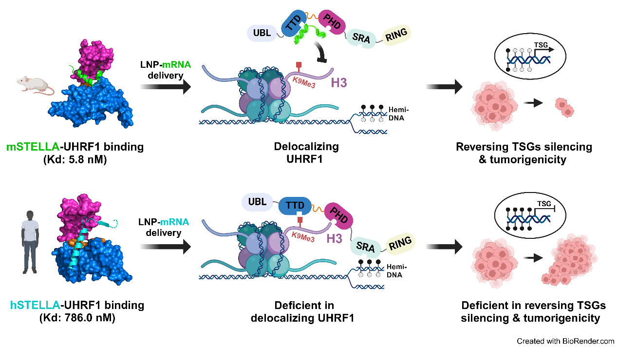 近日,中國科學院廣州生物醫藥與健康研究院與美國約翰霍普金斯大學合作在Nature Communications雜志發表了題為Defining ortholog-specific UHRF1 inhibition by STELLA for cancer therapy的研究成果。該研究在對UHRF1結構域-功能研究基礎上(Cancer Cell, 2019),揭示了多能性調節蛋白STELLA對UHRF1功能抑制的物種特異性與分子機制,進而發展了基于mRNA的UHRF1抑制劑,可有效逆轉DNA甲基化異常并發揮抗實體瘤活性。近日,中國科學院廣州生物醫藥與健康研究院與美國約翰霍普金斯大學合作在Nature Communications雜志發表了題為Defining ortholog-specific UHRF1 inhibition by STELLA for cancer therapy的研究成果。該研究在對UHRF1結構域-功能研究基礎上(Cancer Cell,2019),揭示了多能性調節蛋白STELLA對UHRF1功能抑制的物種特異性與分子機制,進而發展了基于mRNA的UHRF1抑制劑,可有效逆轉DNA甲基化異常并發揮抗實體瘤活性。研究團隊發現,與小鼠STELLA蛋白(mSTELLA)對UHRF1的強抑制活性不同,人源STELLA蛋白(hSTELLA)幾乎無法阻斷UHRF1與染色體結合,以及誘導UHRF1的細胞核輸出。因此,hSTELLA?的UHRF1抑制活性和DNA去甲基化功能明顯弱于mSTELLA。研究人員進一步揭示,STELLA蛋白C端的低保守區域與UHRF1的不同結合模式,可能是介導物種間功能差異的關鍵因素。基于此,研究團隊利用脂質納米顆粒(LNP)介導的mRNA遞送系統,并結合體內/外功能實驗證實:遞送編碼mSTELLA “L”型結合構象的mRNA,可顯著降低腫瘤特異性DNA高甲基化,并通過“表觀遺傳記憶效應 (epigenetic memory effects)”實現對實體腫瘤的持久抑制,而編碼hSTELLA “long α-helix”構象的mRNA則沒有此活性。UHRF1的功能異常與異常譜系分化及多種惡性腫瘤的不良預后密切相關,是腫瘤治療的重要潛在靶標。盡管UHRF1抑制劑的發現已成為制藥工業界和學術界的研究熱點,目前尚無有明確DNA去甲基化活性的特異性抑制劑。該研究不僅為基于mRNA的DNA去甲基化藥物研發奠定基礎,還為模擬mSTELLA作用模式的UHRF1小分子抑制劑發現提供參照。廣州健康院白文靜博士、徐進新研究員、顧文彬博士、王丹陽博士和約翰霍普金斯大學Ying?Cui為本論文共同第一作者。廣州健康院孔祥謙研究員、劉勁松研究員和美國約翰霍普金斯大學Stephen Baylin教授為本論文共同通訊作者。該研究得到了廣州健康院巫林平研究員和中國科學院上海藥物所羅成研究員的大力幫助,以及國家自然科學基金、中國科學院和廣東省人才項目、國家重點研發計劃和廣州健康院自主部署項目等資助。論文鏈接圖?揭示mSTELLA和hSTELLA對UHRF1功能抑制差異的分子基礎,發展UHRF1靶向干預和DNA去甲基化新策略