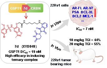 近日,中國科學院廣州生物醫藥與健康研究院許永團隊在治療去勢抵抗性前列腺癌(CRPC)的研究中取得了重要進展。報道了一種在CRPC治療中具有顯著療效的GSPT1選擇性分子膠降解劑XYD049(7d),為開發新的CRPC治療策略提供了有力支持。相關成果已在藥物化學領域Top期刊Journal of Medicinal Chemistry上發表。近日,中國科學院廣州生物醫藥與健康研究院的許永團隊在治療去勢抵抗性前列腺癌(CRPC)的研究中取得了重要進展。他們報道了一種在CRPC治療中具有顯著療效的GSPT1選擇性分子膠降解劑XYD049(7d),為開發新的CRPC治療策略提供了有力支持。相關成果已在藥物化學領域Top期刊Journal of Medicinal Chemistry上發表。前列腺癌是男性中最常見的癌癥之一,而CRPC則是前列腺癌治療中的一大挑戰。作為一種新興的癌癥治療方法,分子膠降解劑通過小分子化合物誘導特定蛋白質的降解,從而抑制癌細胞的生長和擴散,展現了廣闊的應用前景。在這項研究中,許永團隊開發的XYD049,能夠選擇性地誘導前列腺癌22Rv1細胞中GSPT1的降解。GSPT1被認為是難以靶向的癌癥驅動因子。研究結果表明,在前列腺癌細胞22Rv1中,該化合物誘導GSPT1降解和抑制癌細胞增殖的能力,均優于其他已報道的GSPT1降解劑。此外,XYD049在前列腺癌移植瘤小鼠模型中也表現出良好的抗腫瘤效果,腫瘤生長抑制率達到44%(10mg/kg)和55%(20mg/kg)。研究還發現,該化合物能夠下調與CRPC細胞增殖和存活相關的基因,包括雄激素受體(AR)、AR-V7、前列腺特異性抗原(PSA)和c-Myc。這一研究成果為治療去勢抵抗性前列腺癌提供了新的思路和策略,也為開發其他分子膠降解劑藥物提供了重要的參考。許永課題組博士后沈慧為本論文的第一作者,許永研究員和張巖副研究員為通訊作者。該項目得到了國家重點研發計劃、國家自然科學基金面上項目、中國科學院自主部署項目、中國科學院青促會項目和廣東省科技廳項目的支持。論文鏈接新型GSPT1分子膠降解劑的抗前列腺癌研究