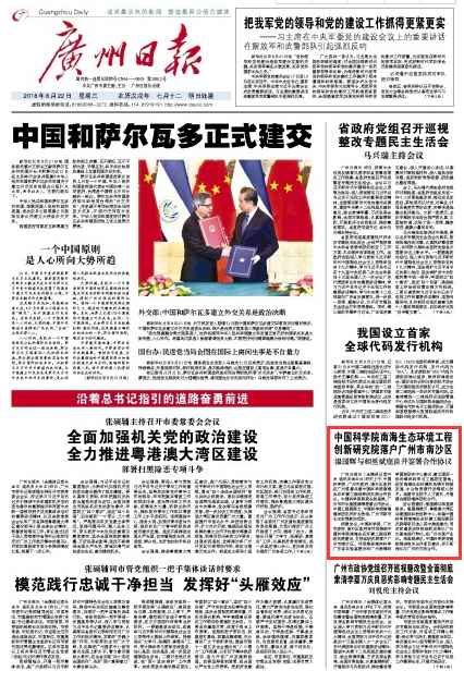 【廣州日報】中國科學院南海生態環境工程創新研究院落戶廣州市南沙區