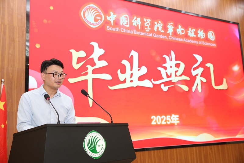典禮在莊嚴的國歌聲中拉開序幕。閆俊華發表了深情的致辭,向全體畢業生致以熱烈祝賀,并感謝導師及親友們的辛勤付出。他回顧了畢業生們在華南植物園的學習歷程,將剛入學的研究生比作種子,在這片學術殿堂里,從最初包裹在堅實外殼中,到在實驗室、文獻堆、野外調查中汲取知識養分,最終破土而出,成長為能夠整合知識、提煉規律、提出創新見解的幼苗。導師們如同辛勤智慧的園丁,以淵博學識、嚴謹態度和耐心關懷為畢業生們提供了最適宜的成長環境。勉勵畢業生們,即將踏入更廣闊復雜的世界,面對風雨挫折時,要回想植物園中在嚴酷環境中傲然挺立的生命,學習它們的堅韌與適應力,保持定力與從容,將挑戰化為成長契機,以積極樂觀心態等待綻放時刻。最后,祝畢業生們帶著無限潛能和蓬勃朝氣,在更廣闊天地茁壯成長。歡迎同學們常回家看看,華南植物園將一如既往地繼續關注畢業生的發展,為畢業生提供支持和幫助。
