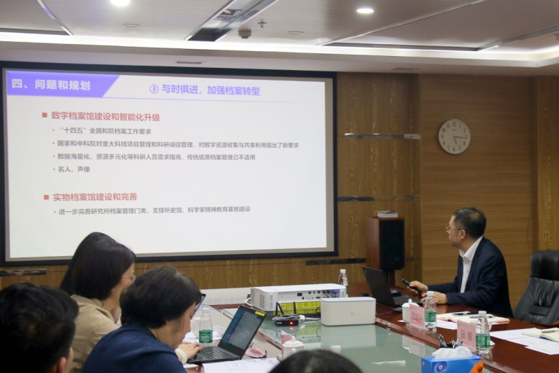 張海祥對潘亞男一行的到來表示熱烈歡迎。他指出廣州地化所一直高度重視檔案工作,對檔案工作的管理也與時俱進,深入貫徹落實國家和院對檔案工作的新要求。他希望院檔案館繼續加強對研究所檔案工作的指導,提升研究所的檔案管理水平和支撐科研的能力,為廣州地化所創新發展貢獻檔案力量、提供檔案智力支持。王強從組織架構、制度建設、條件保障、檔案編研與利用、重大科研項目和重大儀器檔案管理實例、檔案課題研究、數據中心建設等方面系統匯報了廣州地化所的檔案管理工作,并介紹了研究所在檔案信息化建設和檔案資源發掘等方面的工作思路。潘亞男充分肯定了研究所在檔案管理、利用與研修等方面取得的成績,高度贊揚了廣州地化對檔案工作的重視,做到了“有分管、要真管”。她贊同廣州地化所“十四五”檔案工作的總體思路,并從綜合檔案室建設、檔案制度建設、檔案資源建設、課題研究以及信息化建設等方面對研究所檔案工作提出了具體要求。最后,她表示檔案工作是一項系統性、專業性的工作,著力在檔案工作上進一步提質增效,深挖檔案獨特價值,一定會有力支撐研究所高質量發展目標的實現。