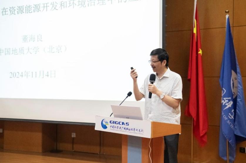 董海良教授是海外杰出青年基金獲得者,長江學者特聘教授,當選美國地質學會、國際地球化學學會、歐洲地球化學學會士,擔任中國礦物巖石地球化學學會第九屆地表與生物地球化學專業(yè)委員會副主任委員、第九屆環(huán)境礦物專業(yè)委員會副主任委員、中國空間科學學會空間生命起源與進化專委會副主任委員。他圍繞礦物-微生物的相互作用,介紹了該過程在關鍵金屬浸取、殺菌材料研制、重金屬污染治理、碳封存與捕集、化石能源增產等領域的重要意義。