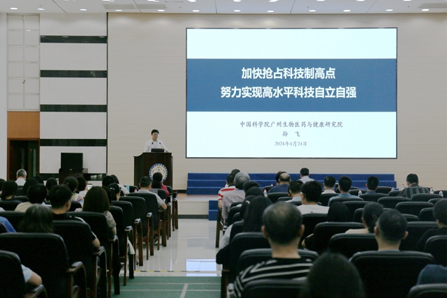 孫飛副院長(主持工作)作了《加快搶占科技制高點,努力實現高水平科技自立自強》的報告。報告傳達了周琪副院長調研健康院講話精神,講解了研究院搶占科技制高點的工作思路,并對下一階段的重點工作進行了部署。孫飛指出,廣州健康院有著良好的科研積累和工作基礎,全體人員要直面問題,增強自信,以搶占科技制高點為目標,再布局再出發。通過重大任務的承擔和實施,更好地履行國家戰略科技力量主力軍的使命擔當,進一步提升研究院科技創新能力和國際影響力。