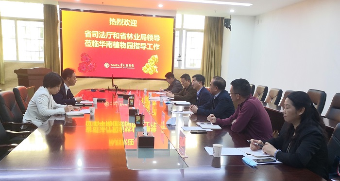 2月20日,廣東省司法廳二級巡視員吳小洪、廣東省林業局二級巡視員蔡應華等一行6人調研廣州分院系統研究所華南植物園交流合作。華南植物園黨委書記/副主任魏平與綜合辦、園藝中心等同志陪同座談交流與參觀調研。