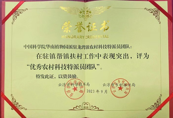 2023年9月22日,云浮市優秀農村科技特派員團隊表彰會在羅定市職業技術學院舉行,華南植物園優秀團隊代表陳國華高級工程師在大會作了先進事跡專題發言。8月23日,廣東省云浮市科技局、云浮市鄉村振興局聯合發文表彰優秀農村科技特派員團隊,華南植物園派駐龍灣鎮的省級農村科技特派員團隊榮獲優秀團隊稱號。
