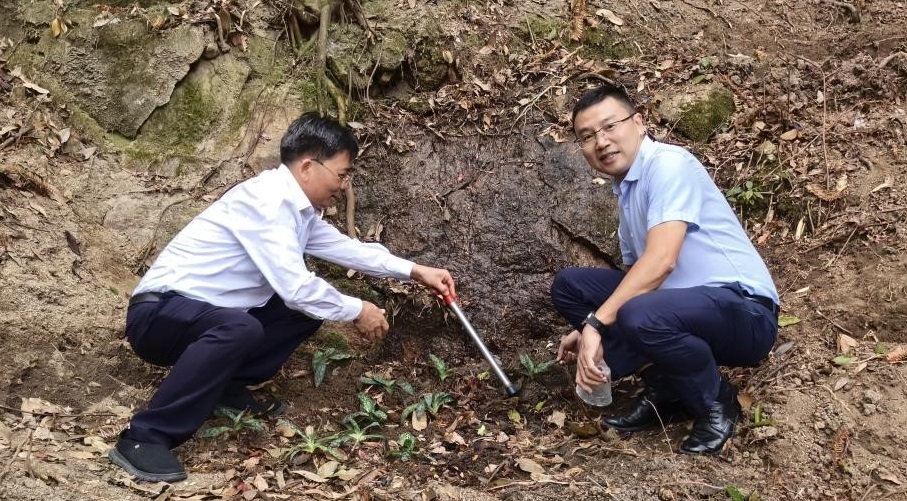 鄭裕庭副縣長(zhǎng)和王俊處長(zhǎng)在進(jìn)行紫紋兜蘭的野外回歸