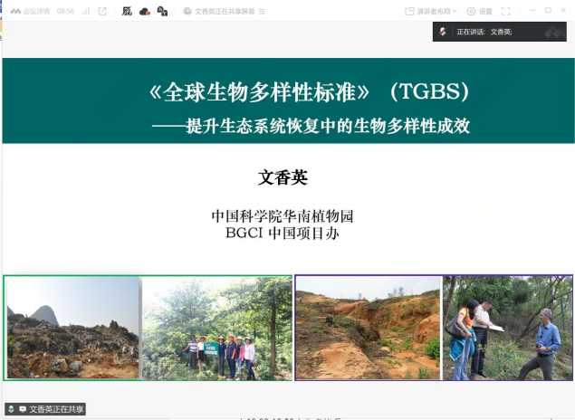 此次研討會設置了五場專題報告與一場集中研討。中國科學院華南植物園文香英高工作了題為《全球生物多樣性標準(TGBS)——提升生態系統恢復中的生物多樣性成效》的開場報告,系統梳理了國際生物多樣性標準的最新進展、核心指標體系及其在生態修復中的實踐路徑,并結合國內外典型案例,深入解析了標準評估與認證的具體流程。報告指出我國已在造林規模和綠色金融領域走在前列,TGBS可作為重要工具,助力我國在生物多樣性保護成效的質量方面進一步引領全球。同時轉達了BGCI秘書長Paul Smith博士的期望:希望中國將TGBS納入政策體系,并愿意支持在中國政府機構內設立TGBS HUB并開展評估師培訓工作。