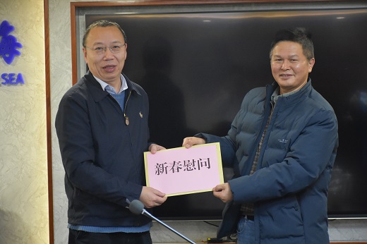 1月17日,在兔年新春佳節(jié)來(lái)臨之際,南海海洋所所長(zhǎng)李超倫,黨委書記、副所長(zhǎng)謝昌龍等到新洲科考船碼頭基地,走訪慰問(wèn)辛勤工作的船隊(duì)一線人員。碼頭基地彩旗飄飄,靠泊的“實(shí)驗(yàn)1”“實(shí)驗(yàn)3”“實(shí)驗(yàn)6”三艘科考船掛起滿旗,船舶內(nèi)部布置的中國(guó)結(jié)、彩燈等顯出喜慶的節(jié)日氣氛。