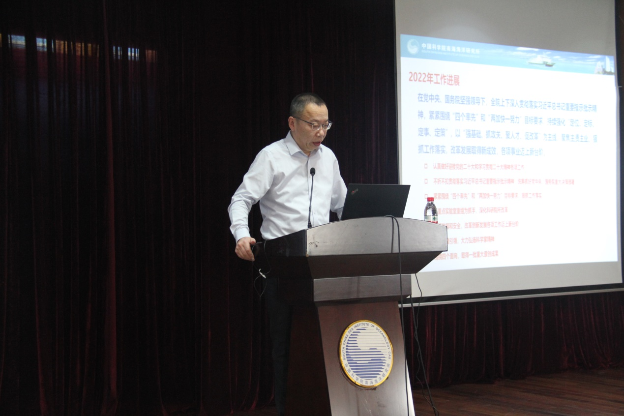 2月23日上午,南海海洋所召開中科院2023年度工作會議精神傳達會,同時通報巡視“回頭看”整改工作進展。所領(lǐng)導(dǎo),所務(wù)委員,黨委委員,紀委委員,各實驗室、臺站、管理及支撐部門負責(zé)人,黨支部書記,職代會、工會、團委、婦委會、學(xué)生會等群團組織負責(zé)人,副高及以上專業(yè)技術(shù)職務(wù)人員、六級及以上職員等參加。會議由副所長林強主持。