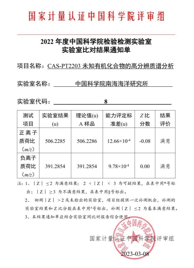 近日,南海海洋研究所儀器設備公共服務中心光譜色譜質譜儀器組技術人員參加2022年度中國科學院檢驗檢測實驗室能力驗證/實驗室間比對活動,“ CAS-PT2203未知有機化合物的高分辨質譜分析 ” 結果評價為 “滿意” 。