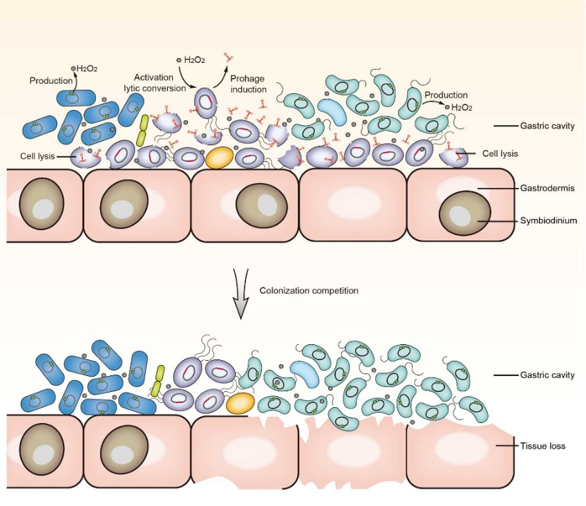 海洋變暖和熱浪威脅著珊瑚礁的健康,造成珊瑚大面積死亡,除了珊瑚白化,由致病菌引發(fā)的珊瑚“組織脫落病”是另一不可忽視的原因。在王曉雪研究員的指導下,王偉權(quán)多次前往三亞鹿回頭海區(qū)及西沙群島七連嶼海域采集叢生盔形珊瑚樣品,分離并鑒定共附生細菌200余株,從中鑒定到引發(fā)珊瑚組織脫落的條件病原菌-溶珊瑚弧菌,并系統(tǒng)深入解析了病原菌的侵染機制。溶珊瑚弧菌利用氨基酸代謝過程產(chǎn)生的過氧化氫,特異性地誘導隱藏在珊瑚共生菌中的溫和噬菌體使其進入裂解循環(huán),從而殺死這些共生菌,占領(lǐng)生態(tài)位,完成定殖和侵染。這一工作為維護珊瑚礁生態(tài)系統(tǒng)的健康提供了新的科學視角,具有重要的科學價值和生態(tài)意義。研究成果以第一作者身份發(fā)表在Nature Ecology & Evolution和Environmental Microbiology等權(quán)威期刊。