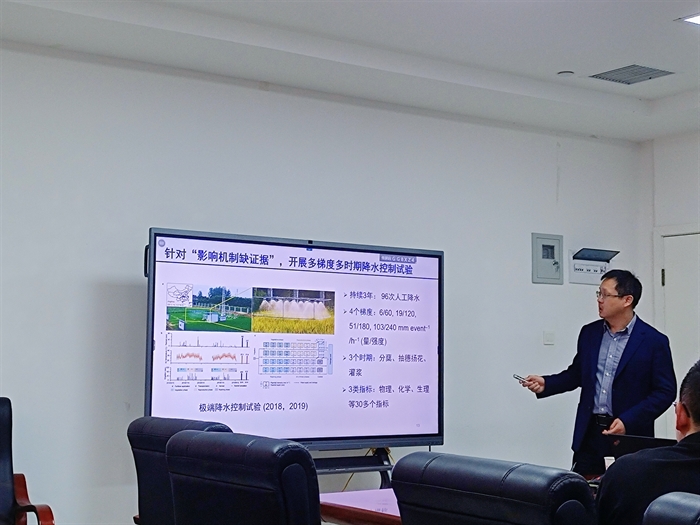 周豐教授作了題為“極端降水對水稻產(chǎn)量的影響機制”的學(xué)術(shù)報告。他在報告中結(jié)合課題組最新研究進展,詳細(xì)介紹了基于聯(lián)網(wǎng)觀測、控制試驗和模型擬合的綜合評估方法。報告重點介紹了其團隊采用新的窗口搜索策略方法,區(qū)分各類極端氣候事件對水稻產(chǎn)量的影響。通過開展降水控制試驗,揭示極端降水造成水稻減產(chǎn)的生物物理和生物化學(xué)機制,并將兩類機制引入陸面過程模型ORCHIDEE-crop,量化了過去和未來極端降水對我國水稻單產(chǎn)的影響規(guī)律。