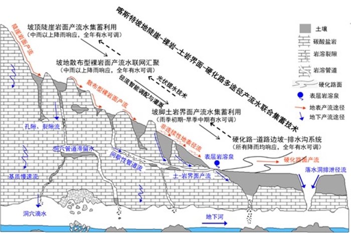 圖1 喀斯特坡地陡崖-裸巖-土巖界面-硬化路多途徑產(chǎn)流水聯(lián)合集蓄技術(shù)原理圖