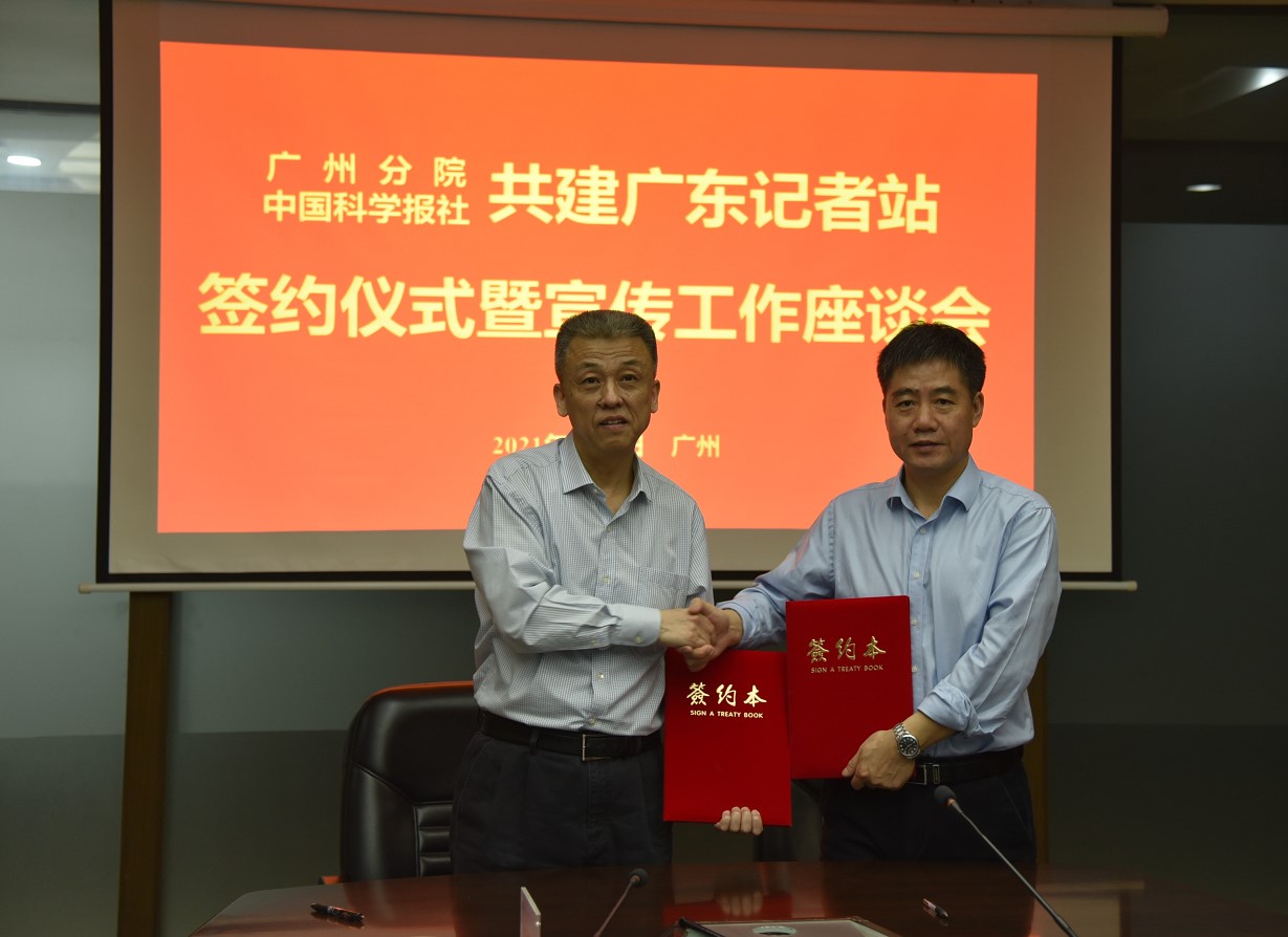 為落實(shí)好《中國(guó)科學(xué)院科學(xué)傳播局關(guān)于支持聯(lián)合共建記者站的通知》文件精神,4月8日,廣州分院與中國(guó)科學(xué)報(bào)社共建廣東記者站協(xié)議續(xù)簽儀式暨宣傳工作座談交流會(huì)在分院機(jī)關(guān)舉行。廣州分院分黨組書(shū)記陳廣浩與中國(guó)科學(xué)報(bào)社黨委書(shū)記劉峰松代表雙方續(xù)簽了共建廣東記者站協(xié)議,并進(jìn)行宣傳工作座談交流。
