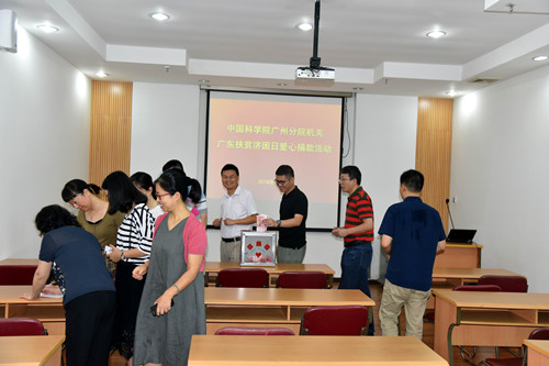 6月22日,中國科學院廣州分院機關黨委組織機關全體在職職工開展廣東扶貧濟困日愛心捐款活動。廣州分院分黨組書記、副院長陳廣浩,分院分黨組副書記、分院機關黨委書記周傳忠出席活動并帶頭現場捐款。