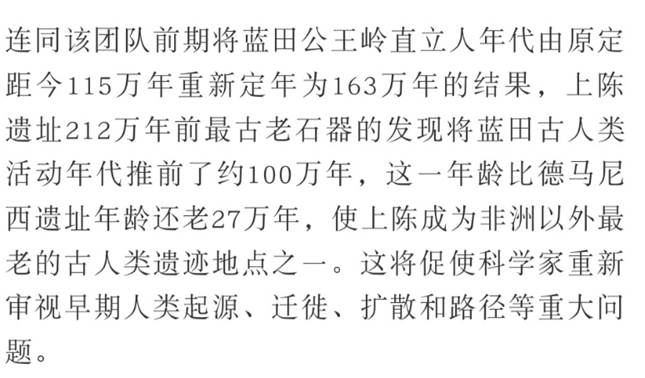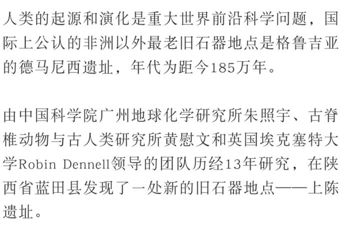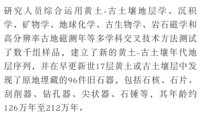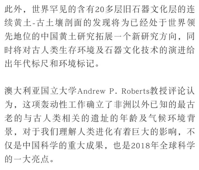 2月27日,科技部基礎研究管理中心召開“2018年度中國科學十大進展專家解讀會”,發布2018年度中國科學十大進展。由中國科學院廣州地球化學研究所朱照宇、中國科學院古脊椎動物與古人類研究所黃慰文和英國埃克塞特大學Robin Dennell等組成的研究團隊所取得的“將人類生活在黃土高原的歷史推前至距今212萬年”進展入選。
