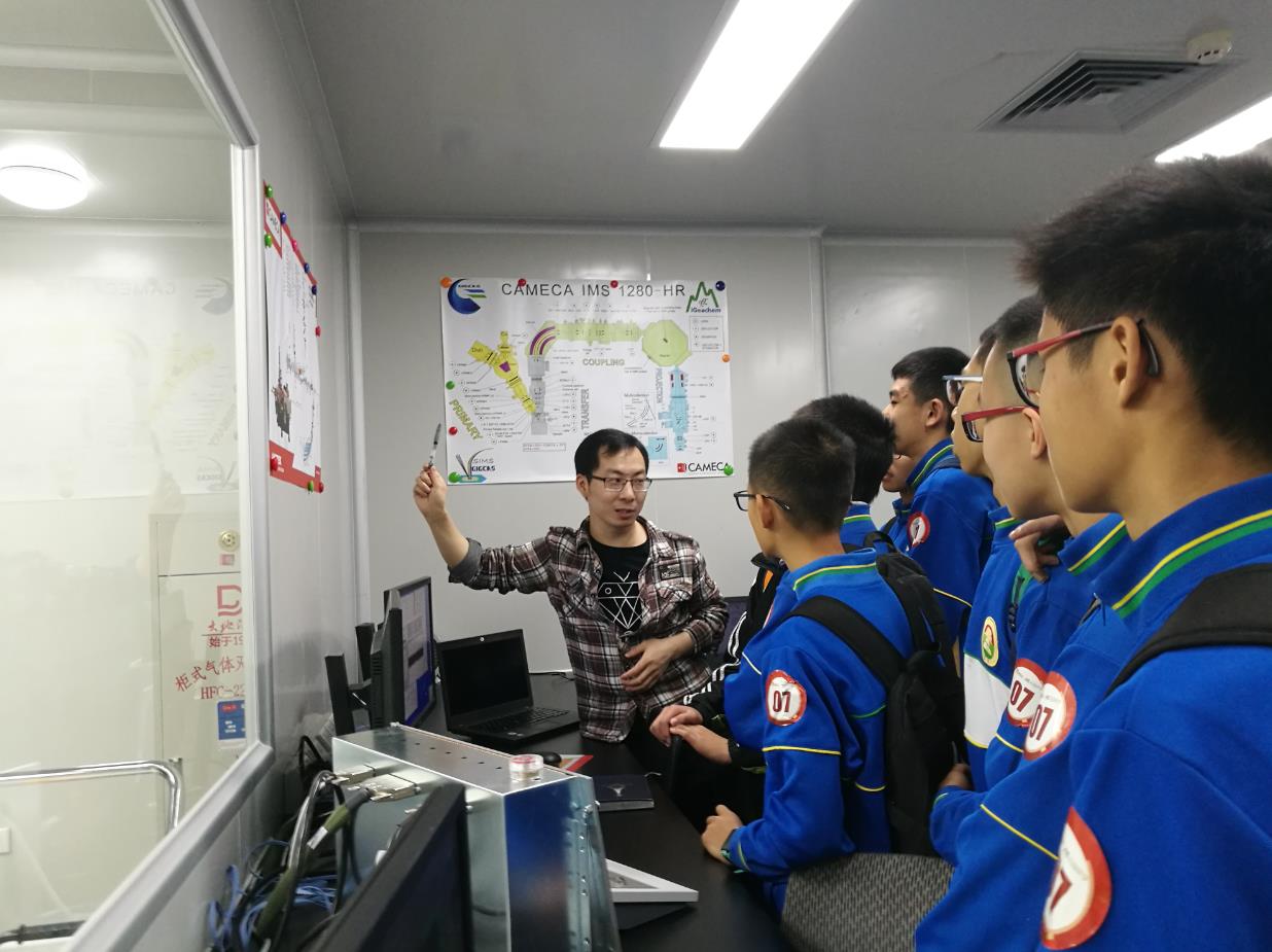 為了讓同學們更好地學習與交流,基地將他們分成4小隊,在志愿者的帶領下交叉參觀科普陳列館、有機地球化學國家重點實驗室的大型煙霧模擬艙和14C專用加速質譜儀,以及同位素地球化學國家重點實驗室的二次離子質譜儀和納米探針。在科普陳列館內,光彩奪目的標本化石、栩栩如生的圖片文案、老科學家娓娓道來的講解,再加上大家即時的交流互動,大家系統地學習了從宇宙形成、地球誕生、生物演化到環境變化等一系列地學知識,初步了解了地球化學學科和廣州地化所研究方向,并認真聆聽了涂光熾、劉東生等我國著名地質學家的生平事跡。在各個實驗室,大家則近距離觀察了各類大型科學儀器,并聽實驗員介紹了儀器的基本原理與實際應用。漫長而神奇的地質歷史、科學且前沿的地學研究、艱苦但光榮的科學家生涯、高端并精密的實驗裝置,無不給同學們帶來深深的震撼和在大家心中留下深刻的印象。