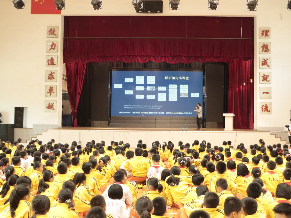 劉星成博士做了主題為“地球里面有什么”的科普報告?!翱催^凡爾納小說《地心游記》的同學請舉手”,現場不少的小朋友們舉起稚嫩的小手。劉星成以科幻小書為起點,以風趣、幽默的話語,通過提問-搶答的互動方式,向孩子們介紹了隕石、隕石對研究地球內部組成的重要性,積極引導、鼓勵大家暢所欲言,讓孩子們了解我們為什么要研究地球內部組成。在提出“如何知道地核成分”、“有什么方法研究地球深部嗎”等問題后,小學生們紛紛舉手,用孩子們的想法來描述他們理解的地球科學探索。尤其是講到“如何能判斷你撿到了一顆隕石”、“月球其實是被一顆巨大的小行星從地球上撞出去的”和“在地下120~150公里處有1,000,000,000,000,000噸鉆石,全部開采出來可以給全世界每人發2000萬顆庫里南鉆石”時,引得學生陣陣驚呼!四十分鐘的報告結束后,許多同學意猶未盡,爭相與劉老師探討交流。