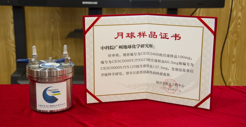7月12日,國家航天局探月與航天工程中心在北京舉行嫦娥五號任務第一批月球科研樣品發放儀式,來自全國13所科研機構的31份申請獲得通過,共獲得首批發放月球樣品17.4764克,標志著月球樣品科學研究工作正式啟動。