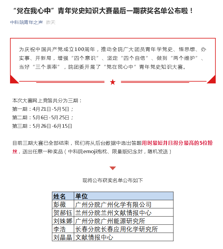 6月15日,中科院團委公布了“黨在我心中”青年黨史知識大賽第三期(5月26日-6月15日)獲獎名單,中科院廣州化學有限公司(廣州化學)團員彭薇在比賽中脫穎而出,憑借答題用時最短并且得分最高取得優異成績。