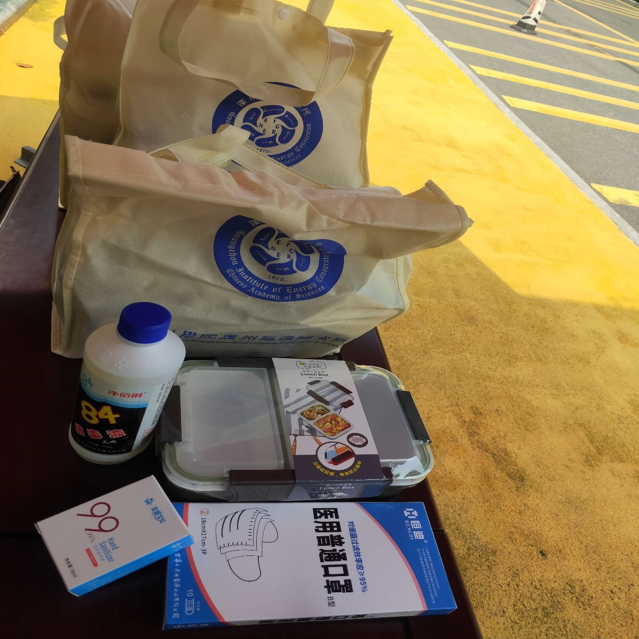 愛心健康包內含5個口罩、1瓶消毒液、1瓶酒精洗手液、1個飯盒