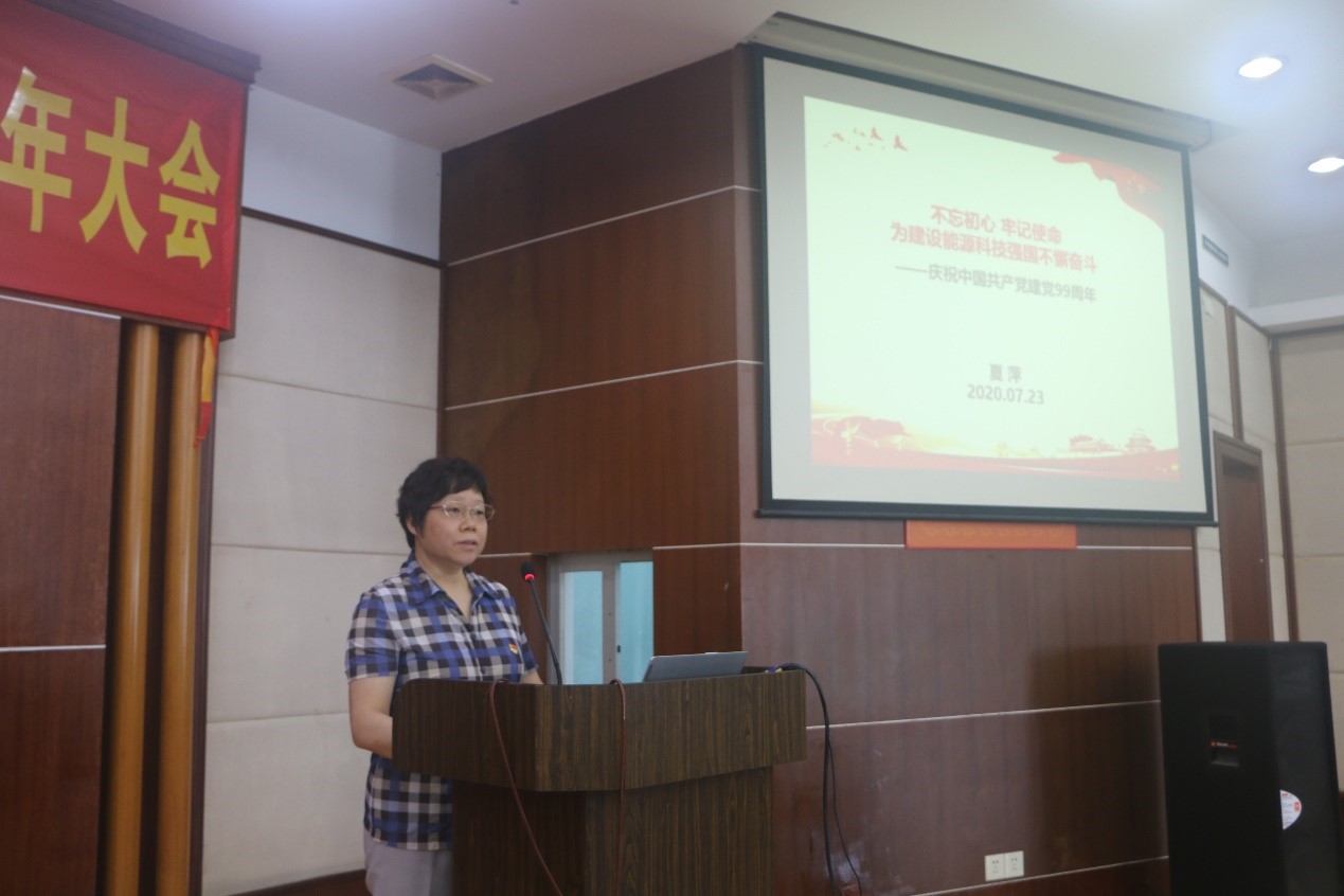 大會在莊嚴的國歌聲中拉開序幕。黨委書記、副所長夏萍首先以《不忘初心 牢記使命,為建設能源科技強國不懈奮斗》為題,作專題黨課報告。夏萍帶領大家重溫了中國共產(chǎn)黨99年以來走過的崢嶸歲月和光輝歷程,號召全體黨員追悟初心,牢記使命擔當。報告重點圍繞國家戰(zhàn)略科技力量的使命和責任,結合研究所工作實際,對職工黨員如何為建設能源科技強國作出貢獻提出了具體要求。夏萍強調,全所黨員、職工要繼承和發(fā)揚中科院優(yōu)良傳統(tǒng),大力弘揚科學家精神,發(fā)揚我國科技工作者在抗擊疫情中所表現(xiàn)的創(chuàng)新進取精神,以更堅定的信心、更強的干勁、更大的勇氣,為實現(xiàn)“三個面向”“四個率先”目標要求、為建設世界科技強國作出更大貢獻。
