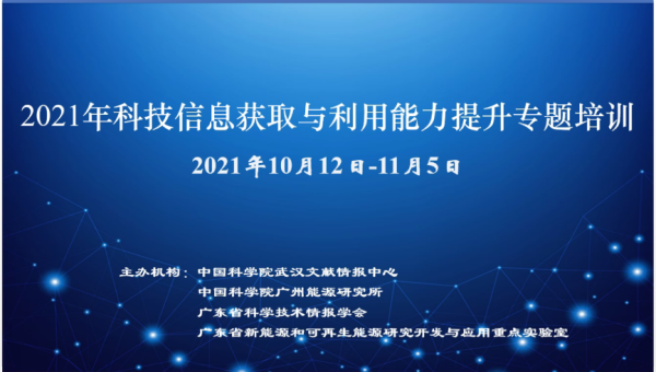 10月12日至11月5日,“2021年科技信息獲取與利用能力提升”專題培訓(xùn)在線舉辦,廣州能源所聯(lián)合中國(guó)科學(xué)院武漢文獻(xiàn)情報(bào)中心、廣東省科學(xué)技術(shù)情報(bào)學(xué)會(huì)等單位共同組織。