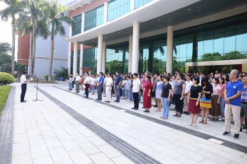 在藍天下,迎著初升的太陽,國旗護旗手們著裝整齊,邁著矯健的步伐,護著鮮艷的五星紅旗入場。伴隨《義勇軍進行曲》,全體師生行注目禮,五星紅旗冉冉升起。