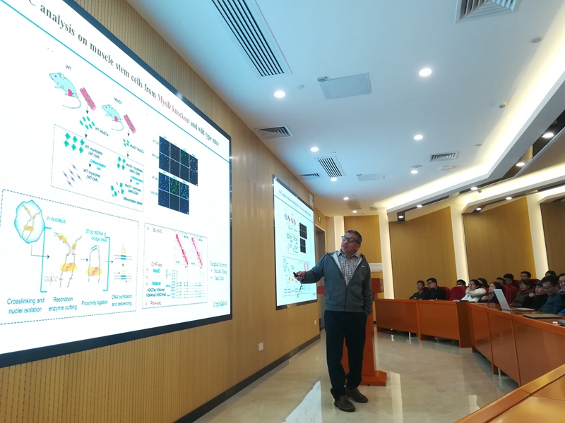 本次報告朱大海教授首先介紹了生肌調節因子(MRFs)之一的MyoD在骨骼肌增殖和分化調控起重要作用。通過高通量測序等一系列的實驗來證明MyoD做為經典譜系轉錄因子,不僅從功能上調控成肌細胞的增殖與分化,更重要的是MyoD從結構上扮演著“Genome Organizer”的角色來調節肌肉細胞命運的決定。隨后,朱大海教授又從衰老方面為我們講解骨骼肌減少癥的分子機制,著重研究了G-CSF和PAX7在肌衛星細胞的維持與再生功能中發揮的作用。最后,朱大海教授從罕見病肌肉營養不良癥(DMD)出發,通過Mdx基因突變小鼠模型,找到一個命名為“002”的化合物,該化合物通過靶向EGF受體在體內和體外實驗中共同證明了“002”可以改善Mdx小鼠的骨骼肌發育。同時,朱大海教授為我們詳細講解了“002”的發現之旅,從2005年至今,該項研究尚未發表。報告結束后,大家踴躍提問,朱大海教授就在場研究人員及學生提出的一系列問題給予了詳細的解答,整個報告持續了2個多小時。