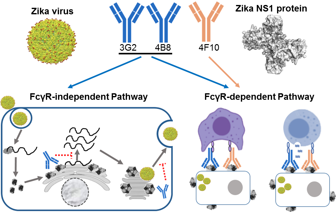 該團(tuán)隊(duì)與廣州市第八人民醫(yī)院庾蕾研究員持續(xù)合作,利用仔鼠感染模型評(píng)估了人源NS1單抗的保護(hù)效果,發(fā)現(xiàn)了一類特殊的NS1單抗,不僅可通過(guò)Fc依賴的途徑(如抗體依賴的細(xì)胞介導(dǎo)的細(xì)胞毒性作用,ADCC)發(fā)揮保護(hù)作用,還可能經(jīng)Fc受體非依賴的途徑抑制病毒復(fù)制。與包膜蛋白(E)抗體不同,NS1單抗不引起ADE風(fēng)險(xiǎn),值得進(jìn)一步開(kāi)發(fā)。該成果拓展了對(duì)NS1抗體作用機(jī)理的認(rèn)識(shí),為單抗藥物及預(yù)防疫苗研究提供了新的依據(jù)。