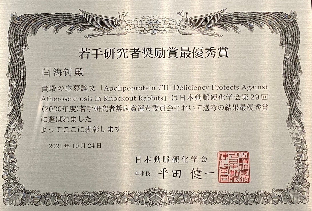 廣州健康院閆海釗博士獲得日本動脈硬化學會青年研究員獎