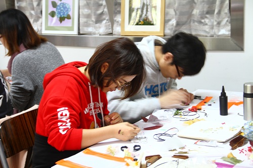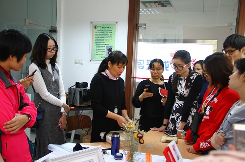 壓花教學。老師教授壓制單瓣薄花的方法并示范,然后由學員動手體驗將一朵鮮花在短時間內壓制成一朵形、色、韻俱在的干花,壓好的精致干花令學員們愛不釋手。