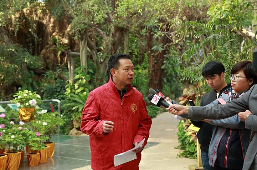 廖景平博士向媒體介紹牡丹花展情況