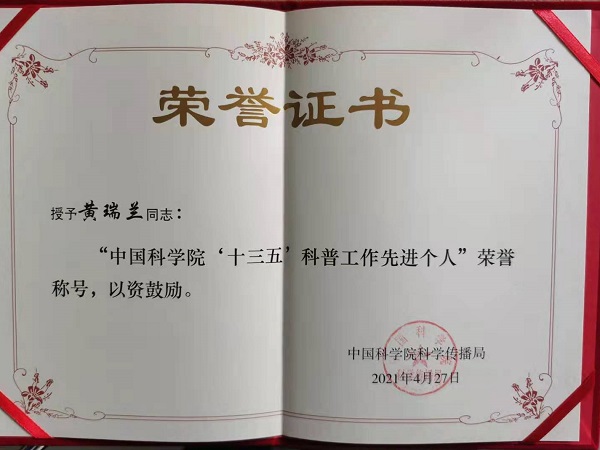 4月26-29日,2021年中國科學院科普培訓大會在上海順利召開。為表彰先進,激勵廣大科普工作者進一步做好新時代科學技術普及工作,科學院傳播局評選出15家先進單位以及40名先進個人進行表彰。我園園藝中心科普旅游部副部長黃瑞蘭榮獲全院“十三五”科普工作先進個人。