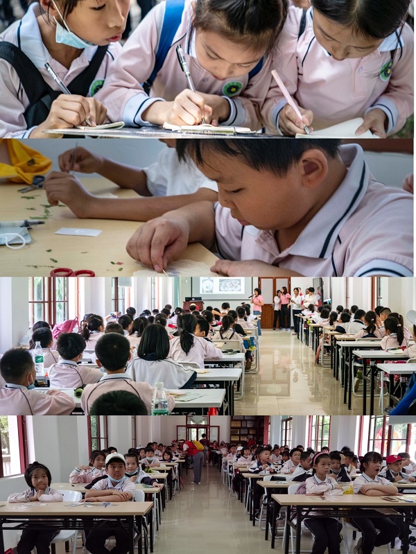 研學營的第二項活動是動手實踐課程,一年級和三年級的孩子們分別體驗了創意植物葉脈標本制作和植物粘貼畫創作。手工實踐的課程總是最受孩子們的歡迎,同學們自覺地圍坐在課桌旁,聚精會神地聽老師講解操作要點。在大致了解如何處理植物樣品及制作葉脈標本的技巧后,或學習如何用植物花材進行優美構圖后,大家便開始自由創造作一張張屬于自己的創意葉脈標本或植物粘貼畫作,信馬由韁,不亦樂乎。