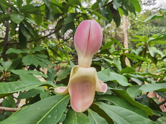 ‘嫣粉’是2009年華南植物園園藝中心利用雜交育種等技術培育的雜交品種,于2015年首次開花。該品種為常綠喬木,樹形優美;葉大,青翠光潤;花紫紅色,清香怡人,四五月盛開時鮮艷奪目,是一種優良園林景觀樹種。喜光照充足和溫暖濕潤的環境,適宜熱帶至亞熱帶地區的庭院、公園等地孤植、對植或群植。