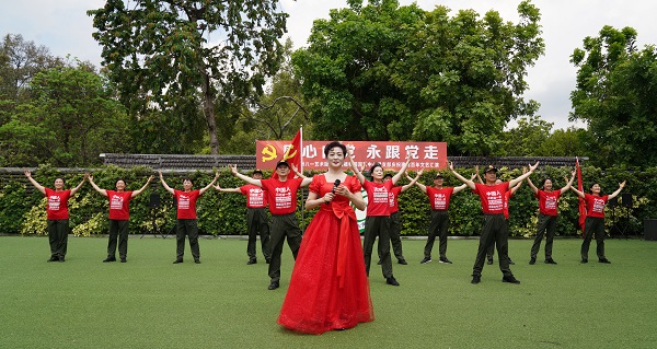 5月23日上午,為慶祝建黨百年華誕,園藝中心黨支部與廣州八一藝術(shù)團(tuán)在華南植物園游覽區(qū)溫室稀樹草坪廣場(chǎng)聯(lián)合舉行主題為“同心向黨、永跟黨走”的慶祝建黨百年文藝匯演,節(jié)目表演以八一藝術(shù)團(tuán)為主,園藝中心黨支部參與了《沒有共產(chǎn)黨就沒有新中國(guó)》《我和我的祖國(guó)》的大合唱。盡管適逢周末,但是為了組織好這次活動(dòng),園藝中心大部分黨員積極參與其中,或參加合唱或作啦啦隊(duì)員搖旗吶喊。此次活動(dòng)園藝中心黨支部有30多名黨員參加,廣州八一藝術(shù)團(tuán)有60多人參加,共計(jì)100余人。華南植物園黨委副書記/紀(jì)委書記徐海出席并致辭,園藝中心副主任/黨支部書記夏漢平領(lǐng)隊(duì)參加活動(dòng)并作發(fā)言。