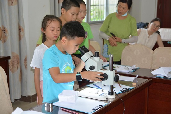 在石縫間、在泥土上,小巧精致的苔蘚隨處可見,仿佛是趁人們一不留神就讓足跡遍布了鼎湖山。形似鳳凰尾羽的鳳尾蘚、細長如絨的白發蘚、擬葉帶三角鈍齒狀的鞭苔……苔蘚植物的多姿多彩讓大家意猶未盡,小朋友們將它們采集到顯微鏡下做進一步觀察。透過顯微鏡,苔蘚在人們眼中纖毫畢現,呈現出一場微觀世界的視覺盛宴。在活動最后,小朋友積極將自己的觀察收獲同大家分享,在實踐與交流中回顧苔蘚之美帶來的觸動與感悟。