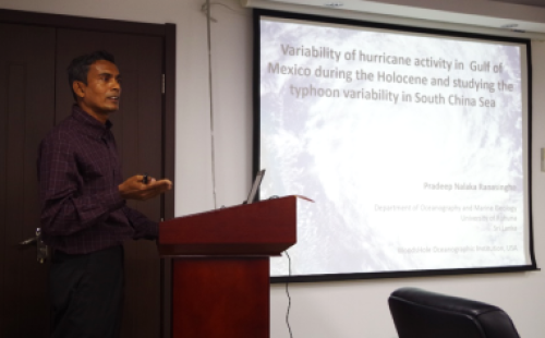 Ranasinghage教授作“Variability of hurricane activity in the Gulf of Mexico during the Holocene and studying the Holocene typhoon variability in South China Sea”報告,匯報了研究進展及新發(fā)現(xiàn)。海洋地質(zhì)室的張?zhí)m蘭博士、物理海洋室的舒業(yè)強博士分別作科研報告,分別報告了在海洋沉積環(huán)境、海洋物理領域的進展和未來設想。